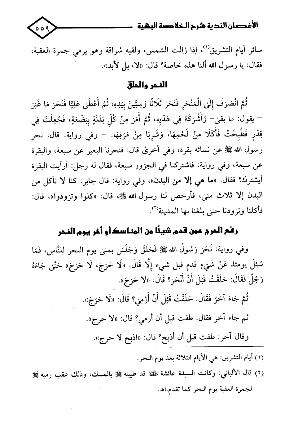 (¬2) قال الألباني: وكانت السيدة عائشة - رضي الله عنها - قد طيبته - صلى الله عليه وسلم - بالمسك، وذلك عقب رميه - صلى الله عليه وسلم - لجمرة العقبة يوم النحر كما تقدم. اهـ.