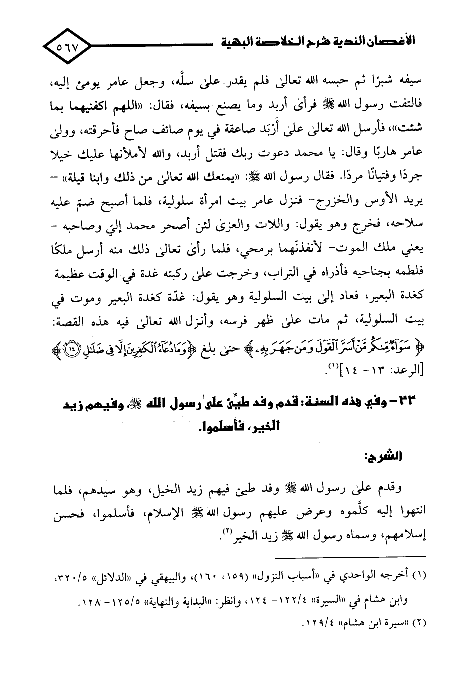 سيفه شبرًا ثم حبسه الله تعالى فلم يقدر على سلَّه، وجعل عامر يومئ إليه، فالتفت رسول الله - صلى الله عليه وسلم - فرأى أربد وما يصنع بسيفه, فقال: "اللهم اكفنيهما بما شئت"، فأرسل الله تعالى على أَرْبَد صاعقة في يوم صائف صاح فأحرقته، وولى عامر هاربًا وقال: يا محمد دعوت ربك فقتل أربد، والله لأملأنها عليك خيلا جردًا وفتيانًا مردًا. فقال رسول الله - صلى الله عليه وسلم -: "يمنعك الله تعالى من ذلك وابنا قيلة" - يريد الأوس والخزرج - فنزل عامر بيت امرأة سلولية، فلما أصبح ضمّ عليه سلاحه، فخرج وهو يقول: واللات والعزى لئن أصحر محمَّد إليّ وصاحبه - يعني ملك الموت - لأنفذنّهما برمحي، فلما رأى تعالى ذلك منه أرسل ملكًا فلطمه بجناحيه فأذراه في التراب، وخرجت على ركبته غدة في الوقت عظيمة كغدة البعير، فعاد إلى بيت السلولية وهو يقول: غدّة كغدة البعير وموت في بيت السلولية، ثم مات على ظهر فرسه، وأنزل الله تعالى فيه هذه القصة: {سَوَاءٌ مِنْكُمْ مَنْ أَسَرَّ الْقَوْلَ وَمَنْ جَهَرَ بِهِ} حتى بلغ {وَمَا دُعَاءُ الْكَافِرِينَ إِلَّا فِي ضَلَالٍ} [الرعد: 13 - 14] (¬1).