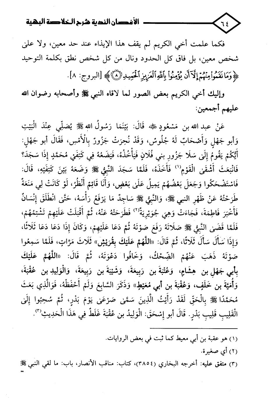 عَنْ عبد الله بن مَسْعُودٍ - رضي الله عنه - قَالَ: بَيْنَمَا رَسُولُ الله - صلى الله عليه وسلم - يُصَلِّي عِنْدَ الْبَيتِ وَأبو جَهْلٍ وَأَصْحَابٌ لَهُ جُلُوسٌ، وَقَدْ نُحِرَتْ جَزُورٌ بِالْأَمْسِ، فَقَالَ أبو جَهْلٍ: أَيُّكُمْ يَقُومُ إلى سَلَا جَزُورِ بني فُلَانٍ فَيَأْخُذُهُ، فَيَضَعُهُ في كَتِفَيْ مُحَمَّدٍ إِذَا سَجَدَ؟ فَانْبَعَثَ أَشْقَى الْقَوْمِ (¬1) فَأَخَذَهُ، فَلَمَّا سَجَدَ النَّبِي - صلى الله عليه وسلم - وَضَعَهُ بَيْنَ كَتِفَيْهِ، قَالَ: فَاسْتَضْحَكُوا وَجَعَلَ بَعْضُهُمْ يَمِيلُ عَلَى بَعْضٍ، وَأَنَا قَائِمٌ أَنْظُرُ، لَوْ كَانَتْ لِي مَنَعَةٌ طَرَحْتُهُ عَنْ ظَهْرِ النبي - صلى الله عليه وسلم -، وَالنَّبِيُّ - صلى الله عليه وسلم - سَاجِدٌ مَا يَرْفَعُ رَأْسَهُ، حَتَّى انْطَلَقَ إِنْسَانٌ فَأَخْبَرَ فَاطِمَةَ، فَجَاءَتْ وَهِيَ جُوَيْرِيَةٌ (¬2) فَطَرَحَتْهُ عَنْهُ، ثُمَّ أَقْبَلَتْ عَلَيْهِمْ تَشْتِمُهُمْ، فَلَمَّا قَضَى النَّبِي - صلى الله عليه وسلم - صَلَاتَهُ رَفَعَ صَوْتَهُ ثُمَّ دَعَا عَلَيهِمْ، وَكَانَ إِذَا دَعَا دَعَا ثَلَاثًا، وإِذَا سَأَلَ سَأَلَ ثَلَاثًا، ثُمَّ قَالَ: "اللهُمَّ عَلَيْكَ بِقُرَيْشٍ" ثَلَاثَ مَرَاتٍ، فَلَمَّا سَمِعُوا صَوْتَهُ ذَهَبَ عَنْهُمْ الضِّحْكُ، وَخَافُوا دَعْوَتَهُ، ثُمَّ قَالَ: "اللهُمَّ عَلَيْكَ بِأبي جَهْلِ بن هِشَامٍ، وَعُتْبَةَ بن رَبِيعَةَ وَشَيْبَةَ بن رَبِيعَةَ وَالْوَلِيدِ بن عُقْبَةَ, وَأُمَيَّةَ بن خَلَفٍ، وَعُقْبَةَ بن أبي مُعَيْطٍ" وَذَكَرَ السَّابعَ وَلَمْ أَحْفَظْهُ، فَوَالَّذِي بَعَثَ مُحَمَّدًا - صلى الله عليه وسلم - بِالْحَقِّ لَقَدْ رَأَيْتُ الَّذِينَ سَمَّى صَرْعَى يَوْمَ بَدْرٍ، ثُمَّ سُحِبُوا إلى الْقَلِيبِ قَلِيبِ بَدْرٍ. قَالَ أبو إِسْحَقَ: الْوَلِيدُ بن عُقْبَةَ غَلَطٌ في هَذَا الْحَدِيثِ (¬3).