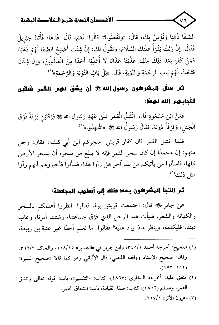 فعَنْ ابْنِ مَسْعُودٍ قَالَ: انْشَقَّ الْقَمَرُ عَلَى عَهْدِ رَسُولِ الله - صلى الله عليه وسلم - فِرْقَتَينِ فِرْقَةً فَوْقَ الْجَبَلِ، وَفِرْقَةً دُونَهُ، فَقَالَ رَسُولُ الله - صلى الله عليه وسلم -: "اشْهَدُوا" (¬2).