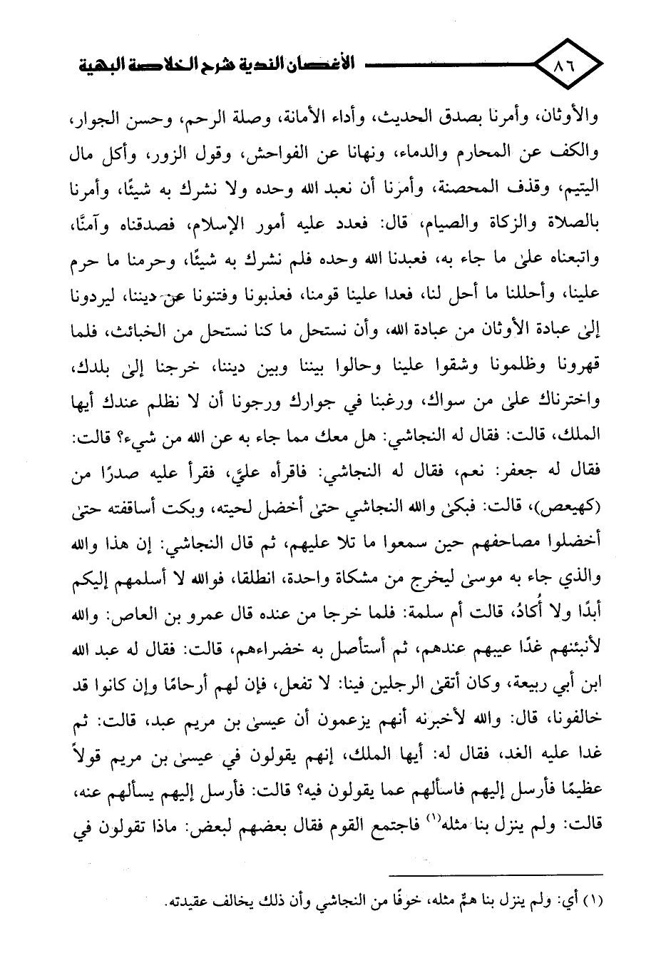 والأوثان، وأمرنا بصدق الحديث، وأداء الأمانة، وصلة الرحم، وحسن الجوار، والكف عن المحارم والدماء، ونهانا عن الفواحش، وقول الزور، وأكل مال اليتيم، وقذف المحصنة، وأمرنا أن نعبد الله وحده ولا نشرك به شيئًا، وأمرنا بالصلاة والزكاة والصيام، قال: فعدد عليه أمور الإسلام، فصدقناه وآمنَّا، واتبعناه على ما جاء به، فعبدنا الله وحده فلم نشرك به شيئًا، وحرمنا ما حرم علينا، وأحللنا ما أحل لنا، فعدا علينا قومنا، فعذبونا وفتنونا عن ديننا، ليردونا إلى عبادة الأوثان من عبادة الله، وأن نستحل ما كنا نستحل من الخبائث، فلما قهرونا وظلمونا وشقوا علينا وحالوا بيننا وبين ديننا، خرجنا إلى بلدك، واخترناك على من سواك، ورغبنا في جوارك ورجونا أن لا نظلم عندك أيها الملك، قالت: فقال له النجاشي: هل معك مما جاء به عن الله من شيء؟ قالت: فقال له جعفر: نعم، فقال له النجاشي: فاقرأه عليَّ، فقرأ عليه صدرًا من (كهيعص)، قالت: فبكى والله النجاشي حتى أخضل لحيته، وبكت أساقفته حتى أخضلوا مصاحفهم حين سمعوا ما تلا عليهم، ثم قال النجاشي: إن هذا والله والذي جاء به موسى ليخرج من مشكاة واحدة، انطلقا، فوالله لا أسلمهم إليكم أبدًا ولا أُكادُ، قالت أم سلمة: فلما خرجا من عنده قال عمرو بن العاص: والله لأنبئنهم غدًا عيبهم عندهم، ثم أستأصل به خضراءهم، قالت: فقال له عبد الله ابن أبي ربيعة، وكان أتقى الرجلين فينا: لا تفعل، فإن لهم أرحامًا وإن كانوا قد خالفونا، قال: والله لأخبرنه أنهم يزعمون أن عيسى بن مريم عبد، قالت: ثم غدا عليه الغد، فقال له: أيها الملك، إنهم يقولون في عيسى بن مريم قولاً عظيمًا فأرسل إليهم فاسألهم عما يقولون فيه؟ قالت: فأرسل إليهم يسألهم عنه، قالت: ولم ينزل بنا مثله (¬1) فاجتمع القوم فقال بعضهم لبعض: ماذا تقولون في