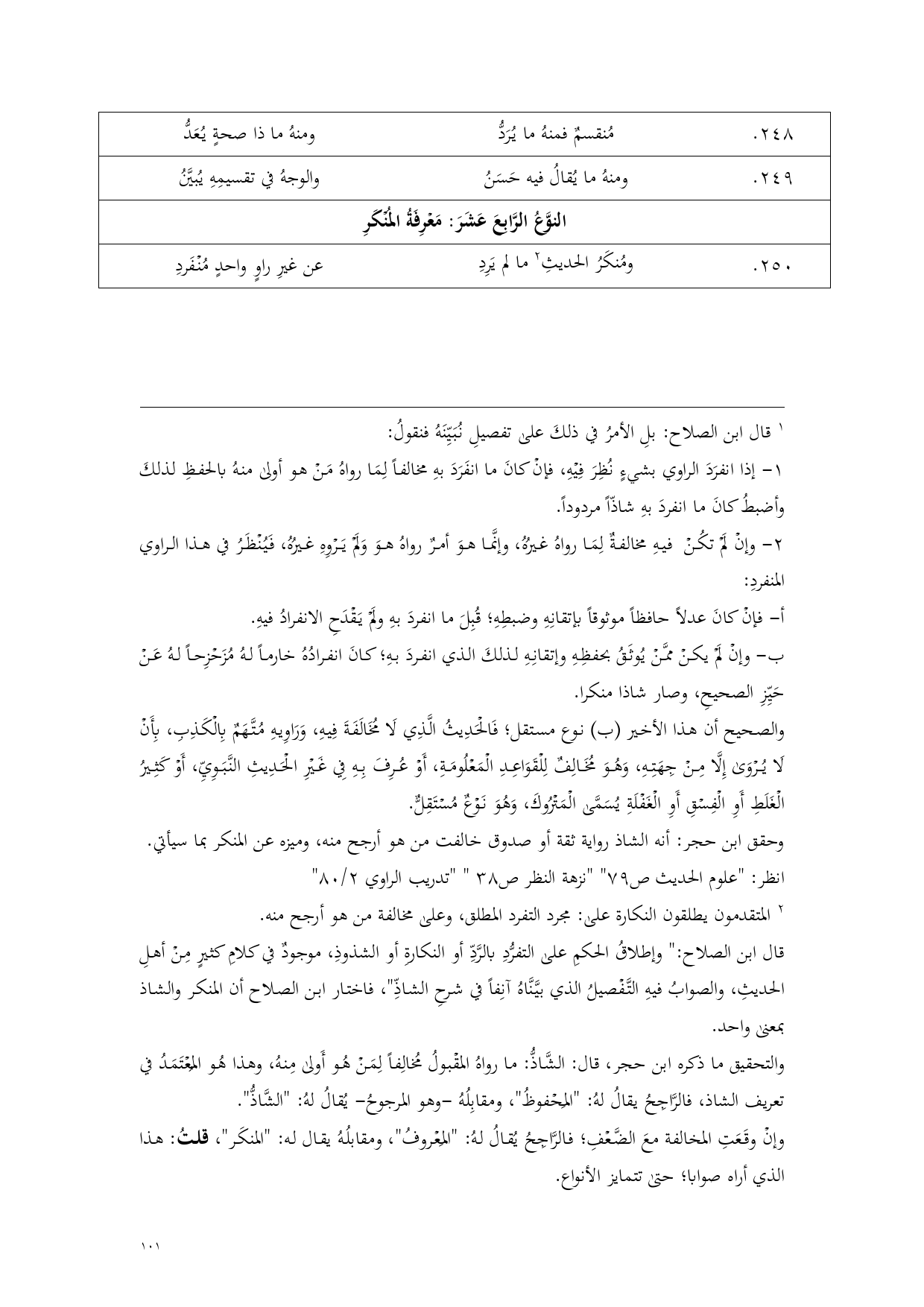 قال ابن الصلاح: " وإطلاقُ الحكمِ على التفرُّدِ بالرَّدِّ أو النكارةِ أو الشذوذِ، موجودٌ في كلامِ كثيرٍ مِنْ أهلِ الحديثِ، والصوابُ فيهِ التَّفْصيلُ الذي بيَّنَّاهُ آنِفاً في شرحِ الشاذِّ"، فاختار ابن الصلاح أن المنكر والشاذ بمعنى واحد.