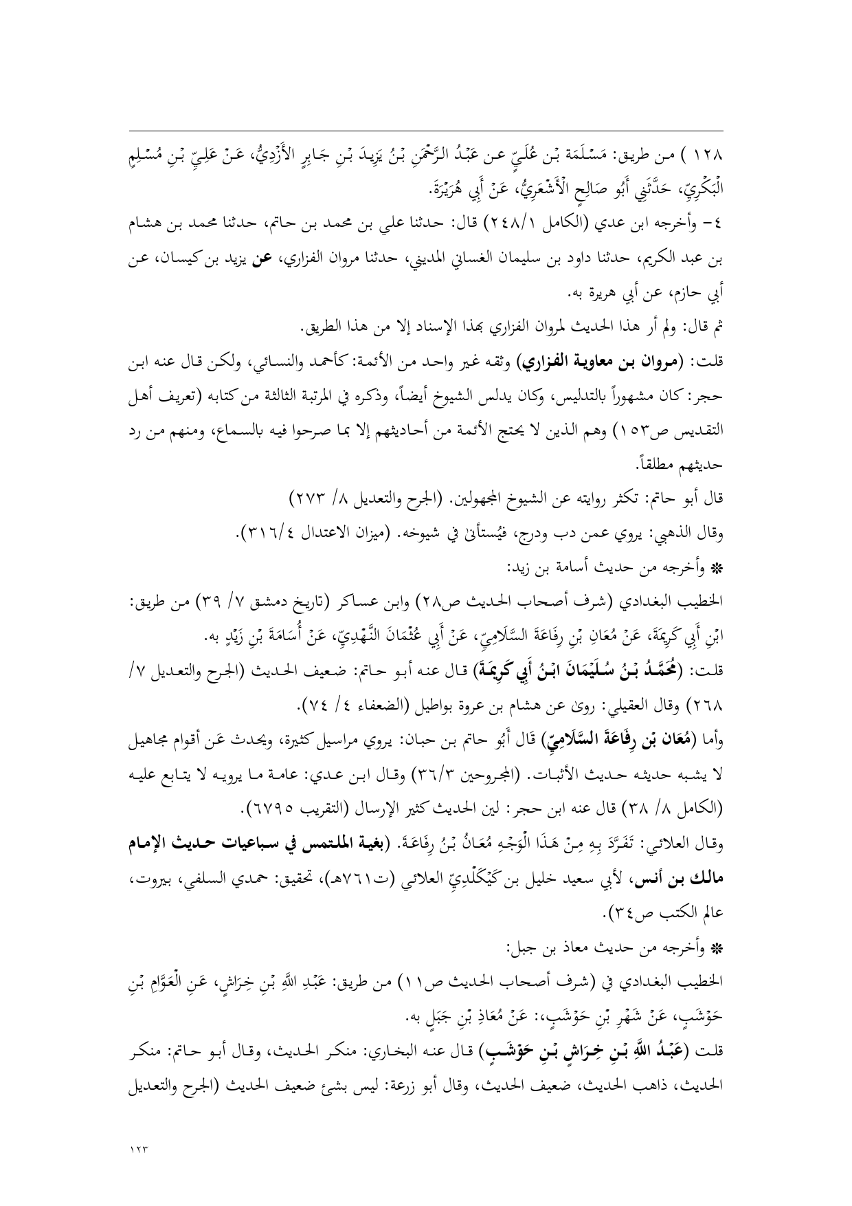 الخطيب البغدادي (شرف أصحاب الحديث ص 28) وابن عساكر (تاريخ دمشق 7/ 39) من طريق: ابْنِ أَبِي كَرِيمَةَ، عَنْ مُعَانِ بْنِ رِفَاعَةَ السَّلَامِيِّ، عَنْ أَبِي عُثْمَانَ النَّهْدِيِّ، عَنْ أُسَامَةَ بْنِ زَيْدٍ به.
