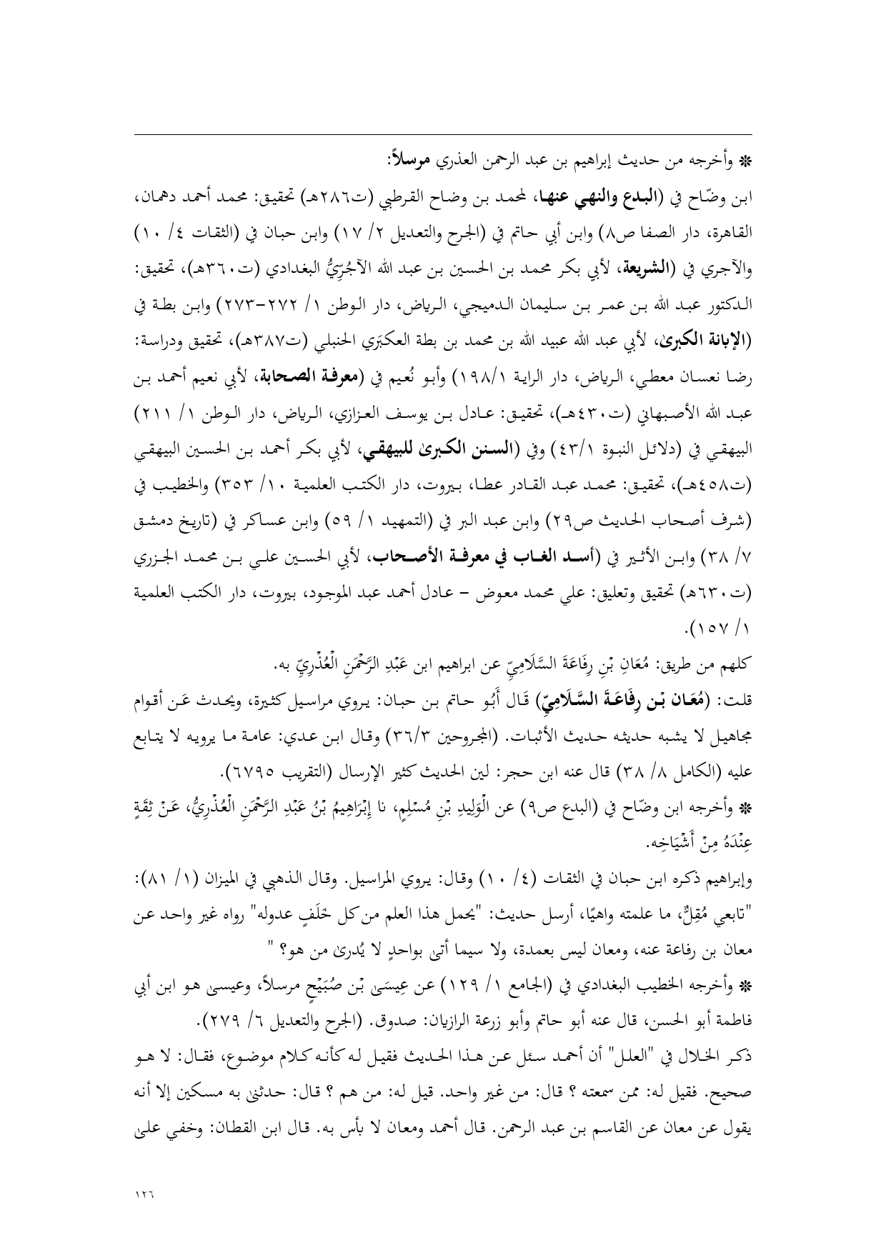 وإبراهيم ذكره ابن حبان في الثقات (4/ 10) وقال: يروي المراسيل. وقال الذهبي في الميزان (1/ 81): "تابعي مُقِلٌّ، ما علمته واهيًا، أرسل حديث: "يحمل هذا العلم من كل خَلَفٍ عدوله" رواه غير واحد عن معان بن رفاعة عنه، ومعان ليس بعمدة، ولا سيما أتى بواحدٍ لا يُدرى من هو؟ "