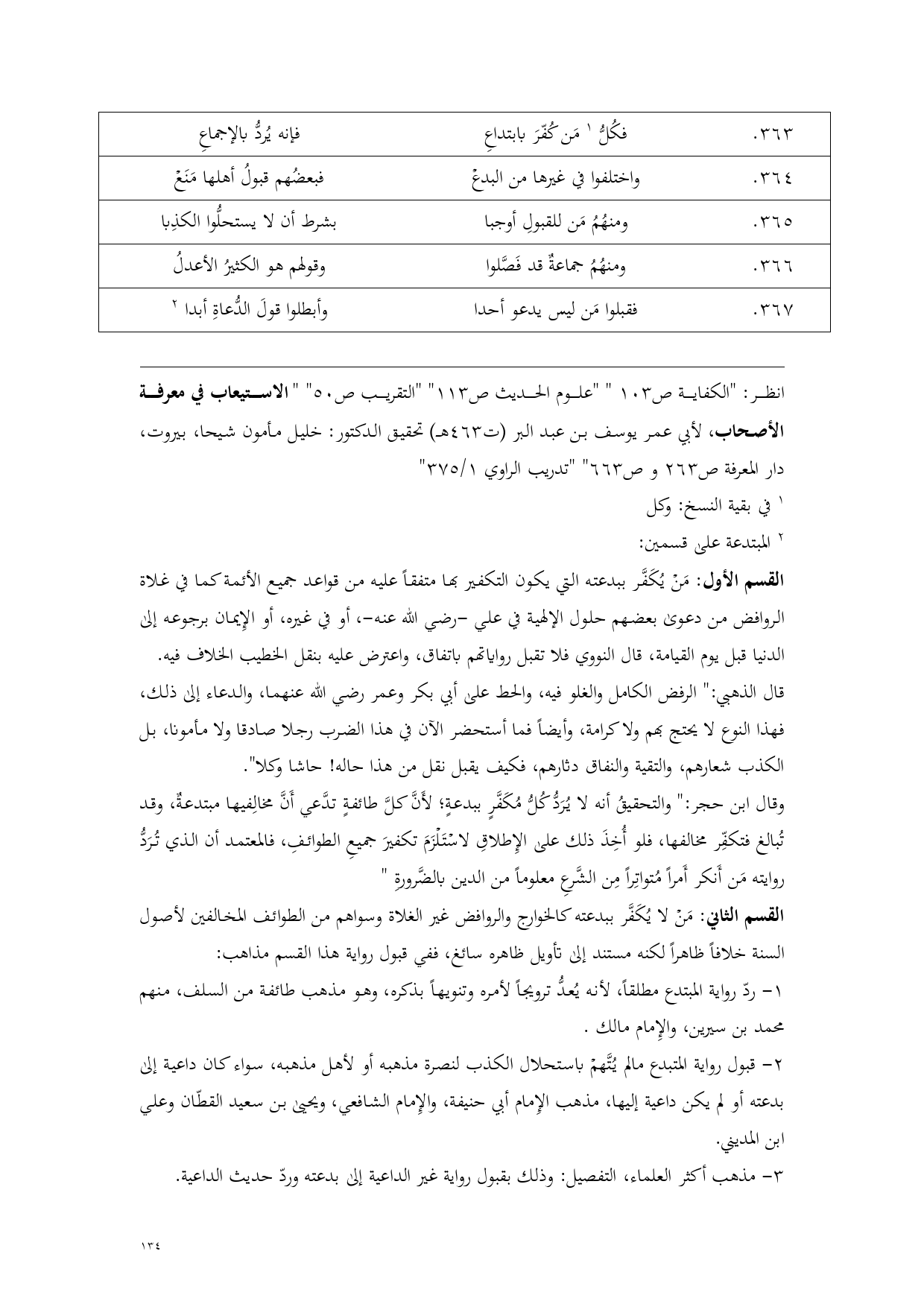 363 - فكُلُّ (¬1) مَن كُفّرَ بابتداعِ ... فإنه يُردُّ بالإجماع