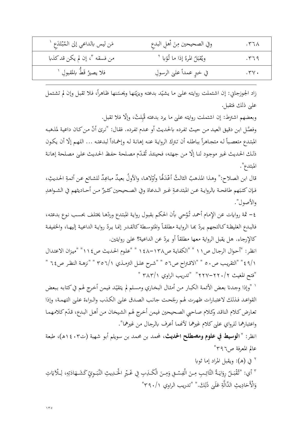 (¬1) "وإذا وجدنا بعض الأئمة الكبار من أمثال البخاري ومسلم لم يتقيّد فيمن أخرج لهم في كتابه ببعض القواعد فذلك لاعتبارات ظهرت لهم رجّحت جانب الصدق على الكذب والبراءة على التهمة، وإذا تعارض كلام الناقد وكلام صاحبي الصحيحين فيمن أخرج لهم الشيخان من أهل البدع، قدّم كلامهما واعتبارهما للرواي على كلام غيرهما لأنهما أعرف بالرجال من غيرهما".