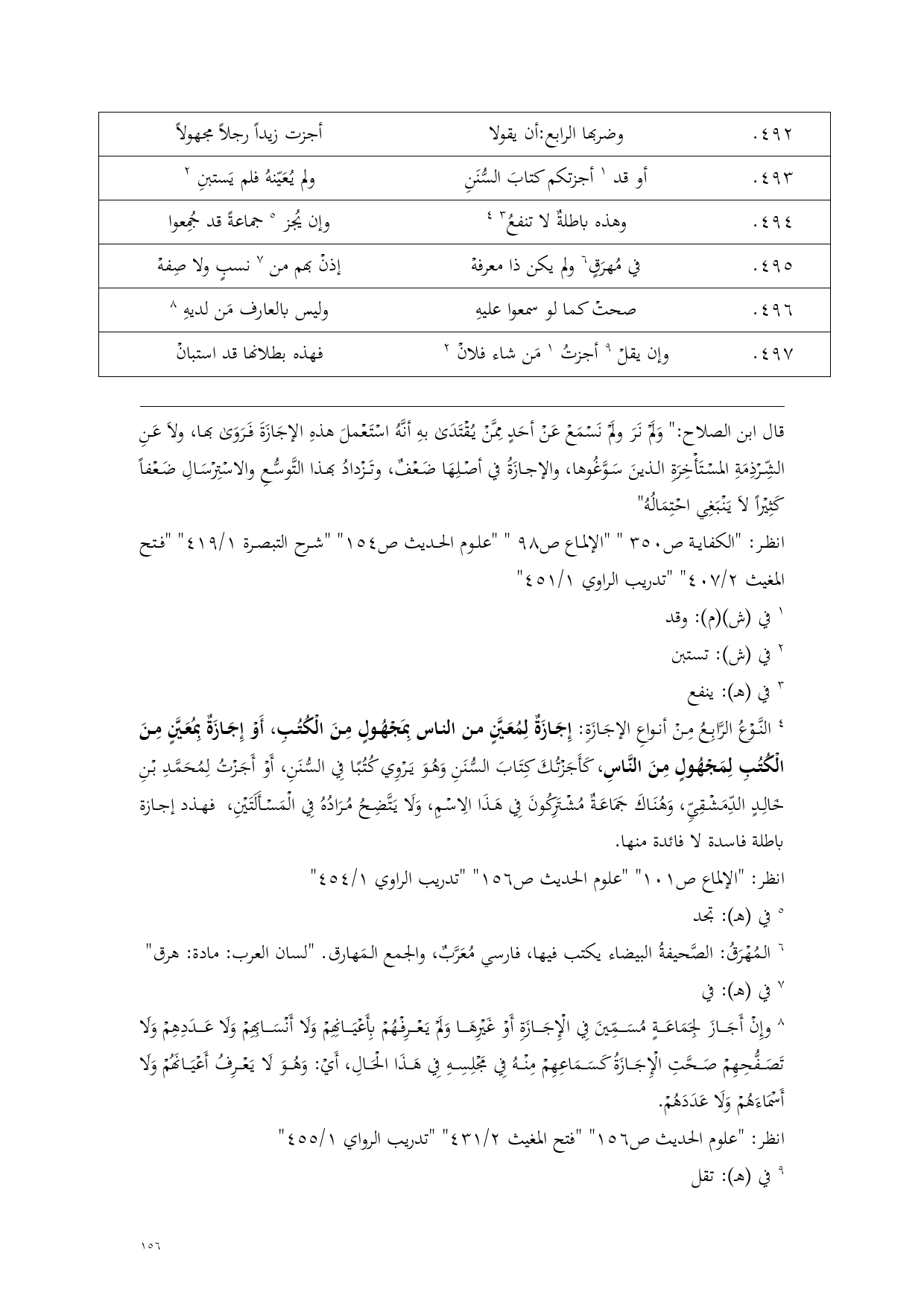 (¬4) النَّوْعُ الرَّابِعُ مِنْ أنواعِ الإجَازَةِ: إِجَازَةٌ لِمُعَيَّنٍ من الناس بِمَجْهُولٍ مِنَ الْكُتُبِ، أَوْ إِجَازَةٌ بِمُعَيَّنٍ مِنَ الْكُتُبِ لِمَجْهُولٍ مِنَ النَّاسِ، كَأَجَزْتُكَ كِتَابَ السُّنَنِ وَهُوَ يَرْوِي كُتُبًا فِي السُّنَنِ، أَوْ أَجَزْتُ لِمُحَمَّدِ بْنِ خَالِدٍ الدِّمَشْقِيِّ، وَهُنَاكَ جَمَاعَةٌ مُشْتَرِكُونَ فِي هَذَا الِاسْمِ، وَلَا يَتَّضِحُ مُرَادُهُ فِي الْمَسْأَلَتَيْنِ، فهذد إجازة باطلة فاسدة لا فائدة منها.