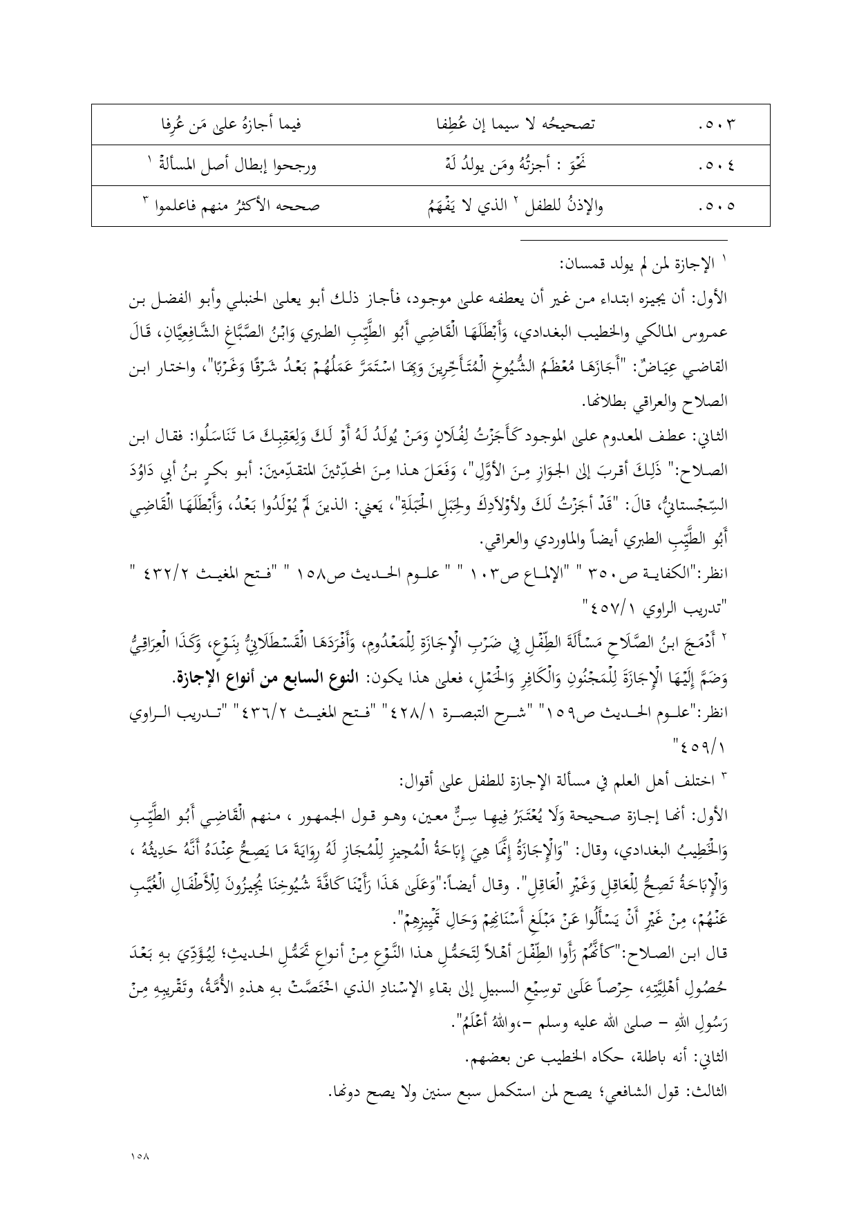(¬2) أَدْمَجَ ابنُ الصَّلَاحِ مَسْأَلَةَ الطِّفْلِ فِي ضَرْبِ الْإِجَازَةِ لِلْمَعْدُومِ، وَأَفْرَدَهَا الْقَسْطَلَانِيُّ بِنَوْعٍ، وَكَذَا الْعِرَاقِيُّ وَضَمَّ إِلَيْهَا الْإِجَازَةَ لِلْمَجْنُونِ وَالْكَافِرِ وَالْحَمْلِ، فعلى هذا يكون: النوع السابع من أنواع الإجازة.