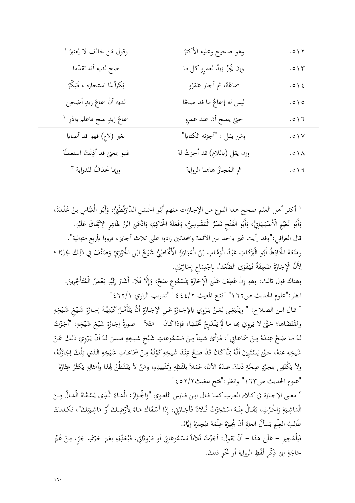 (¬1) أكثر أهل العلم صحح هذا النوع من الإجازات منهم أَبُو الْحَسَنِ الدَّارَقُطْنِيُّ، وَأَبُو الْعَبَّاسِ بنُ عُقْدَةَ، وَأَبُو نُعَيْمٍ الْأَصْبَهَانِيُّ، وَأَبُو الْفَتْحِ نَصْرٌ الْمَقْدِسِيُّ، وَفَعَلَهُ الْحَاكِمُ، وَادَّعَى ابْنُ طَاهِرٍ الِاتِّفَاقَ عَلَيْهِ.