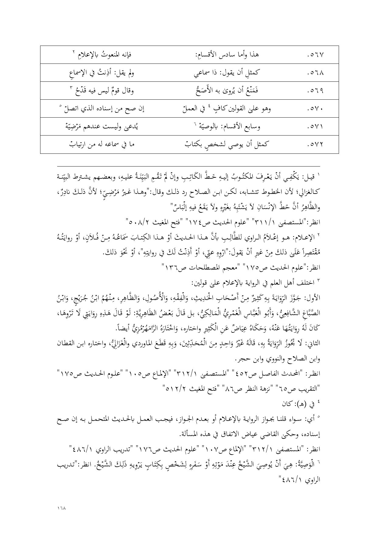 (¬1) الإعلام: هو إعْلاَمُ الراوي للطَّالِبِ بأنَّ هذا الحديثَ أوْ هذا الكِتابَ سَمَاعُهُ مِنْ فُلاَنٍ، أوْ روايَتُهُ مُقْتَصِراً عَلَى ذلكَ مِنْ غيرِ أنْ يَقولَ: "ارْوِهِ عنِّي، أوْ أَذِنْتُ لَكَ في روايتِهِ"، أوْ نَحْوَ ذلكَ.