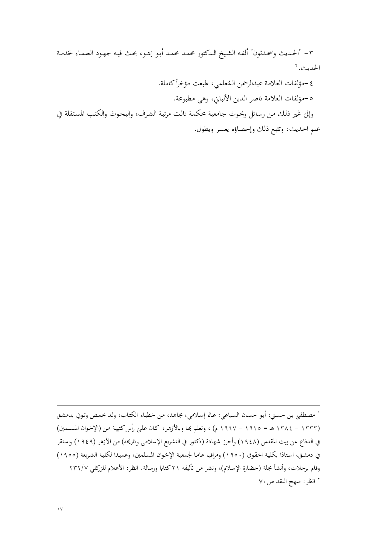 3 - "الحديث والمحدثون" ألفه الشيخ الدكتور محمد محمد أبو زهو، بحث فيه جهود العلماء لخدمة الحديث. (¬1)