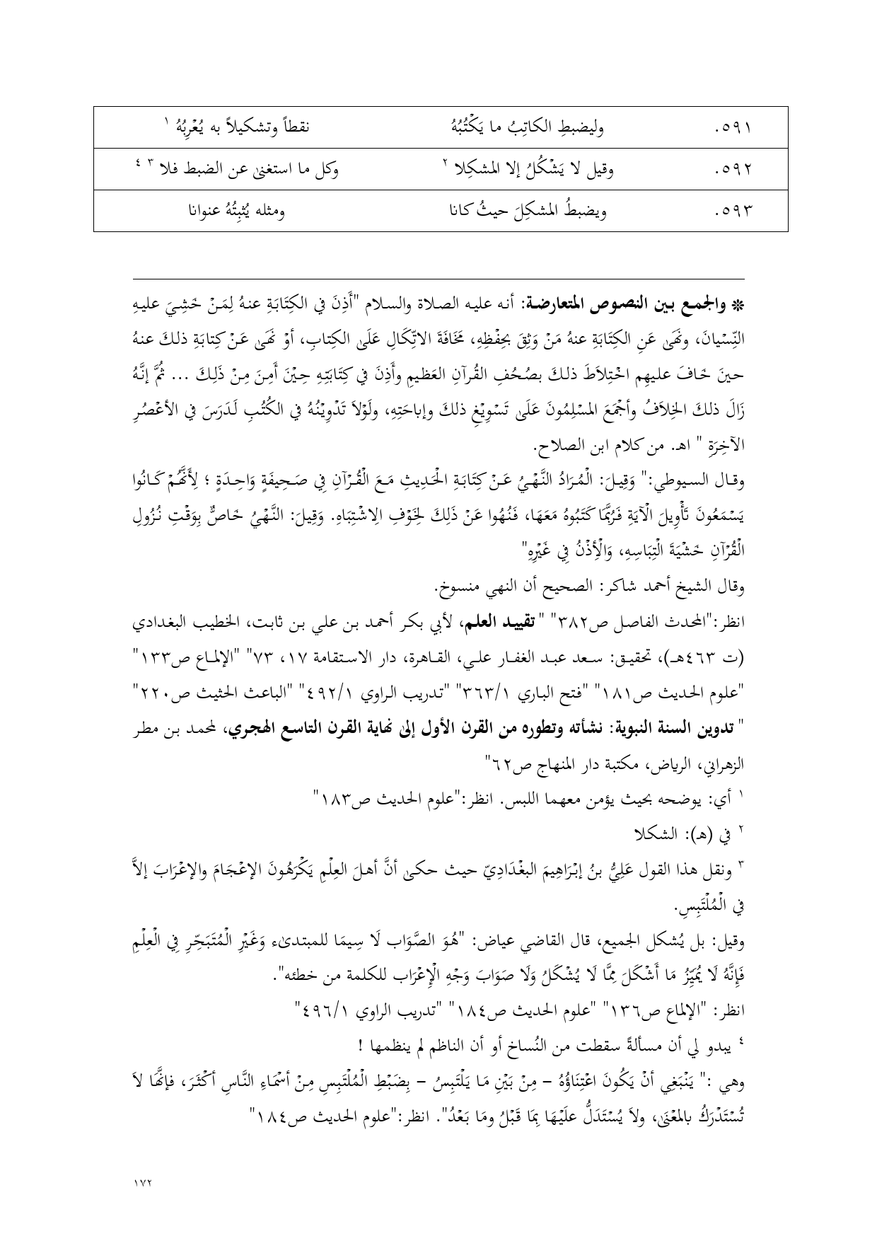 * والجمع بين النصوص المتعارضة: أنه عليه الصلاة والسلام "أَذِنَ في الكِتَابَةِ عنهُ لِمَنْ خَشِيَ عليهِ النِّسْيانَ، ونَهَى عَنِ الكِتَابَةِ عنهُ مَنْ وَثِقَ بحِفْظِهِ، مَخَافَةَ الاتِّكَالِ عَلَى الكِتابِ، أوْ نَهَى عَنْ كِتابَةِ ذلكَ عنهُ حينَ خَافَ عليهِم اخْتِلاَطَ ذلكَ بصُحُفِ القُرآنِ العَظيمِ وأَذِنَ في كِتَابَتِهِ حِيْنَ أَمِنَ مِنْ ذَلِكَ ... ثُمَّ إنَّهُ زَالَ ذلكَ الخِلاَفُ وأجْمَعَ المسْلِمُونَ عَلَى تَسْوِيْغِ ذلكَ وإباحَتِهِ، ولَوْلاَ تَدْوِيْنُهُ في الكُتُبِ لَدَرَسَ في الأعْصُرِ الآخِرَةِ " اهـ. من كلام ابن الصلاح.