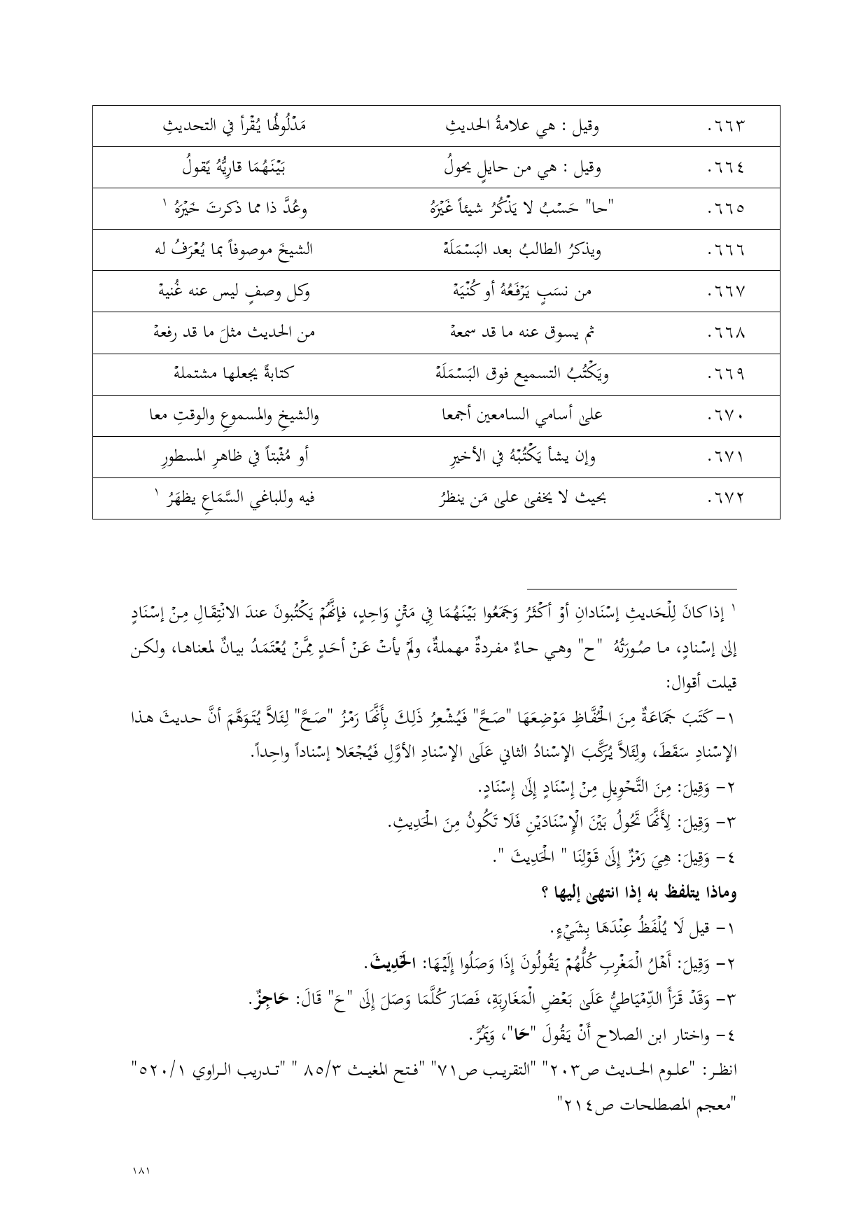 (¬1) إذا كانَ لِلْحَديثِ إسْنَادانِ أوْ أكْثَرُ وَجَمَعُوا بَيْنَهُمَا فِي مَتْنٍ وَاحِدٍ، فإنَّهُمْ يَكْتُبونَ عندَ الانْتِقَالِ مِنْ إسْنَادٍ إلى إسْنادٍ، ما صُورَتُهُ "ح" وهي حاءٌ مفردةٌ مهملةٌ، ولَمْ يأتْ عَنْ أحَدٍ مِمَّنْ يُعْتَمَدُ بيانٌ لمعناها، ولكن قيلت أقوال:
