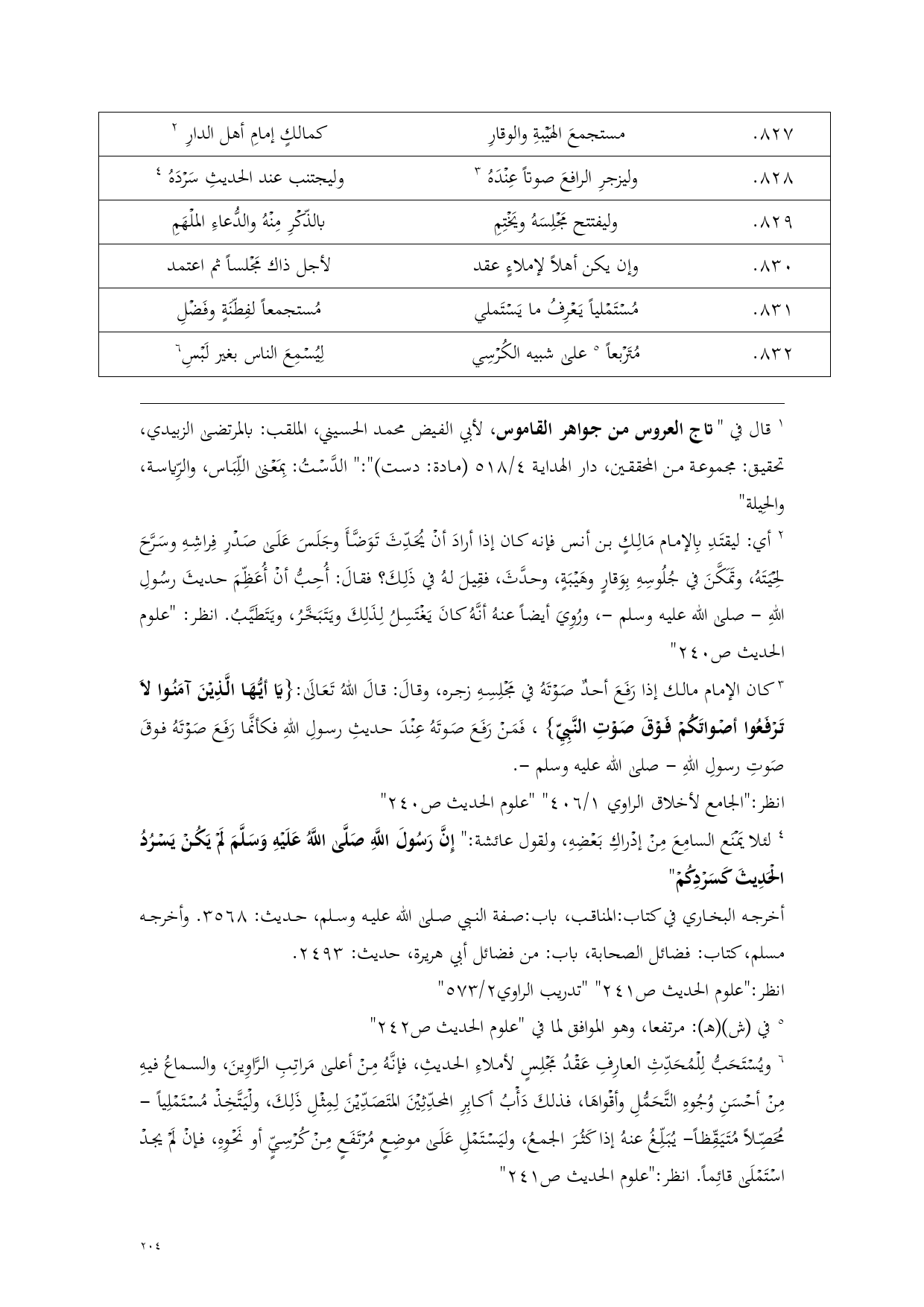 (¬1) أي: ليقتَدِ بِالإمام مَالِكٍ بن أنس فإنه كان إذا أرادَ أنْ يُحَدِّثَ تَوَضَّأَ وجَلَسَ عَلَى صَدْرِ فِراشِهِ وسَرَّحَ لِحْيَتَهُ، وتَمَكَّنَ في جُلُوسِهِ بِوَقارٍ وهَيْبَةٍ، وحدَّثَ، فقِيلَ لهُ في ذَلِكَ؟ فقالَ: أُحِبُّ أنْ أُعَظِّمَ حديثَ رسُولِ اللهِ - صلى الله عليه وسلم -، ورُوِيَ أيضاً عنهُ أنَّهُ كانَ يَغْتَسِلُ لِذَلِكَ ويَتَبَخَّرُ، ويَتَطَيَّبُ. انظر: "علوم الحديث ص 240"