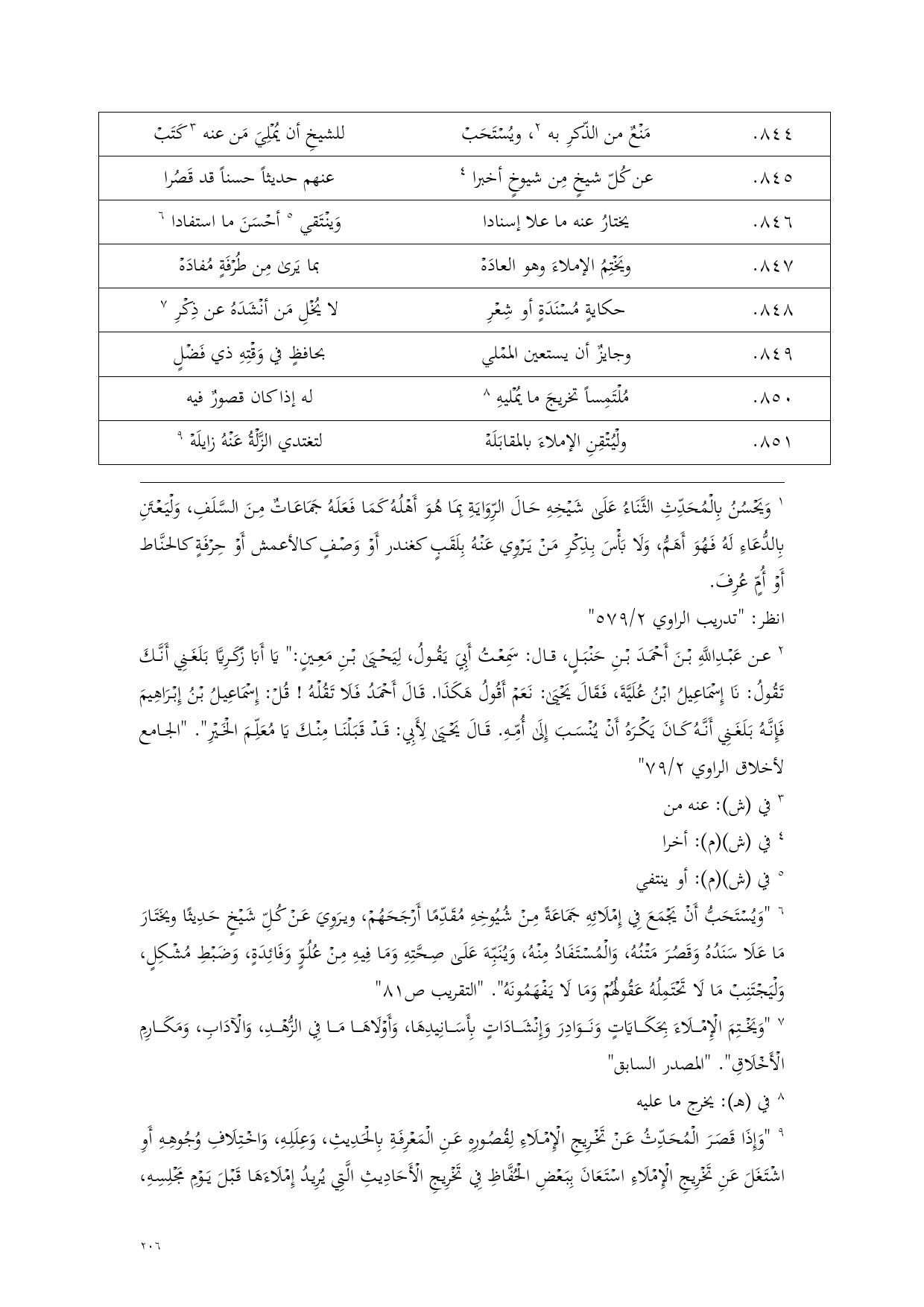 (¬5) "وَيُسْتَحَبُّ أَنْ يَجْمَعَ فِي إِمْلَائِهِ جَمَاعَةً مِنْ شُيُوخِهِ مُقَدِّمًا أَرْجَحَهُمْ، ويرَوِيَ عَنْ كُلِّ شَيْخٍ حَدِيثًا ويخَتَارَ مَا عَلَا سَنَدُهُ وَقَصُرَ مَتْنُهُ، وَالْمُسْتَفَادُ مِنْهُ، وَيُنَبِّهَ عَلَى صِحَّتِهِ وَمَا فِيهِ مِنْ عُلُوٍّ وَفَائِدَةٍ، وَضَبْطِ مُشْكِلٍ، وَلْيَجْتَنِبْ مَا لَا تَحْتَمِلُهُ عَقُولُهُمْ وَمَا لَا يَفْهَمُونَهُ". "التقريب ص 81"
