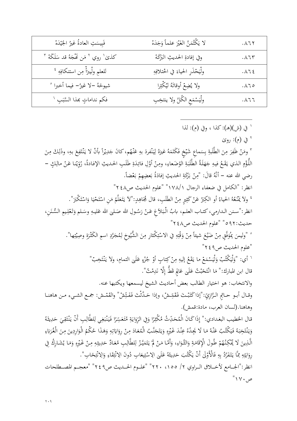 (¬5) "وليسَ بِمُوَفَّقٍ مِنْ ضَيَّعَ شيئاً مِنْ وَقْتِهِ في الاسْتِكْثارِ مِنَ الشُّيُوخِ لِمُجَرَّدِ اسمِ الكَثْرَةِ وصِيْتِها".
