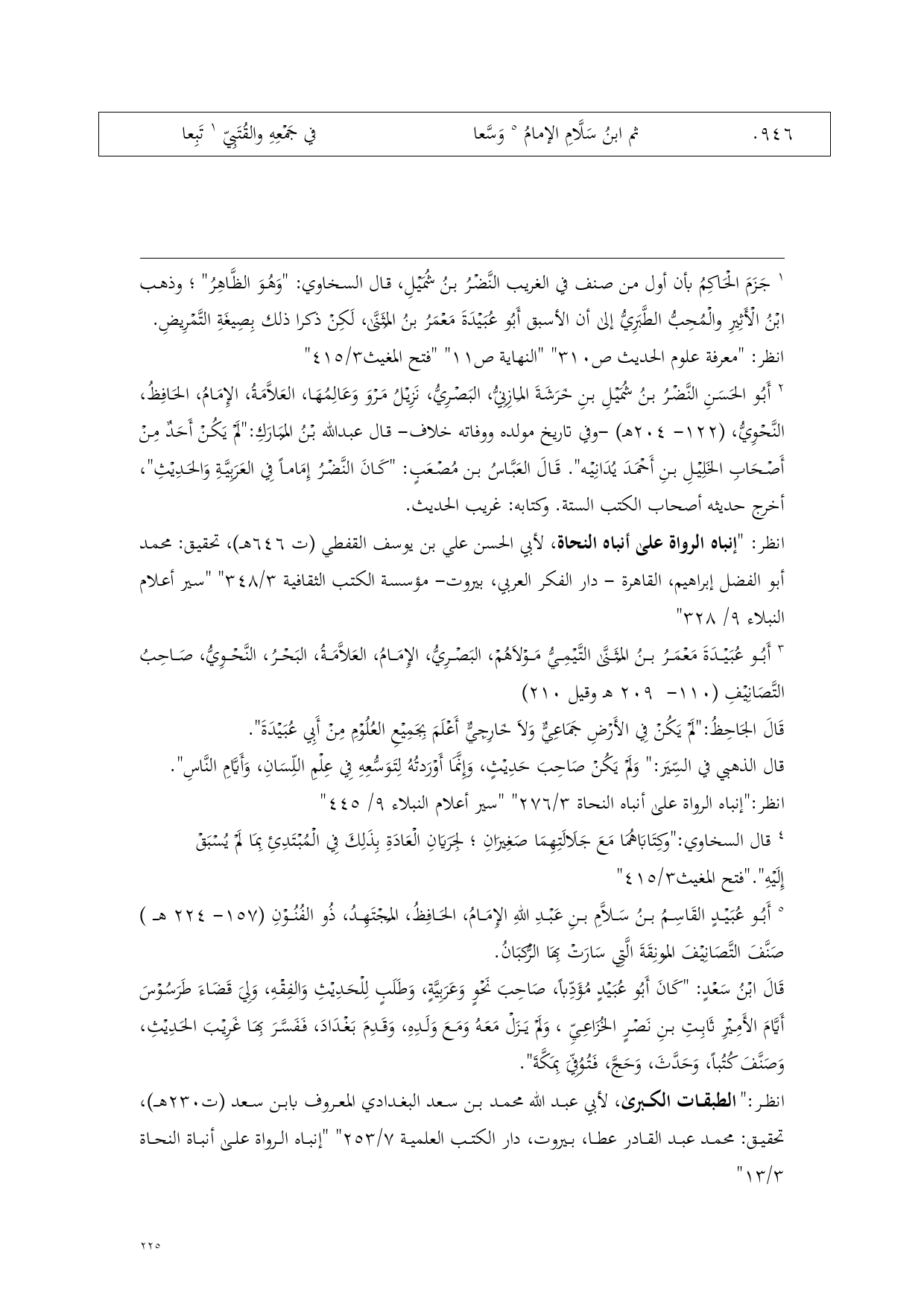 (¬1) أَبُو عُبَيْدٍ القَاسِمُ بنُ سَلاَّمِ بنِ عَبْدِ اللهِ الإِمَامُ، الحَافِظُ، المُجْتَهِدُ، ذُو الفُنُوْنِ (157 - 224 هـ) صَنَّفَ التَّصَانِيْفَ المُونِقَةَ الَّتِي سَارَتْ بِهَا الرُّكبَانُ.