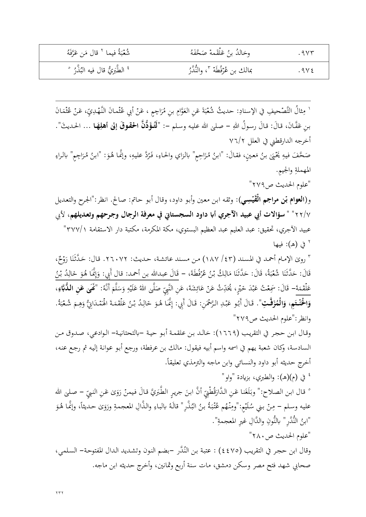 (¬4) قال ابن الصلاح: " وبَلَغَنا عَنِ الدَّارَقُطْنِيِّ أنَّ ابنَ جريرٍ الطَّبَريَّ قالَ فيمنْ رَوَى عَنِ النبيِّ - صلى الله عليه وسلم - مِنْ بني سُلَيْمٍ: "ومِنْهُم عُتْبَةُ بنُ البُذَّرِ" قالَهُ بالباءِ والذَّالِ المعجمةِ ورَوَى حديثاً، وإنَّما هُوَ "ابنُ النُّدَّرِ" بالنُّونِ والدَّالِ غيرِ المعجمةِ".