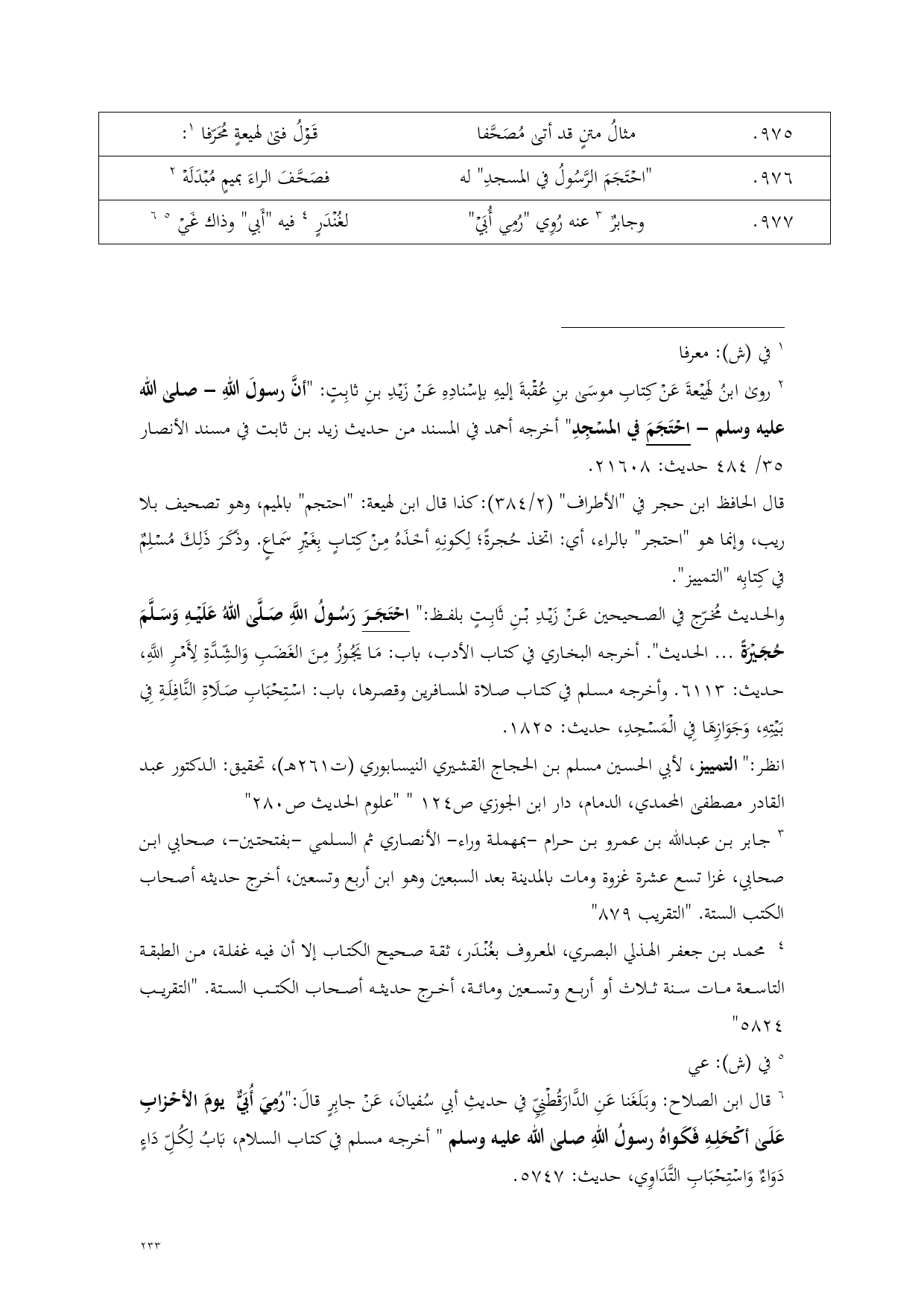976 - "احْتَجَمَ الرَّسُولُ في المسجدِ" له ... فصَحَّفَ الراءَ بميمٍ مُبْدَلَهْ (¬2)