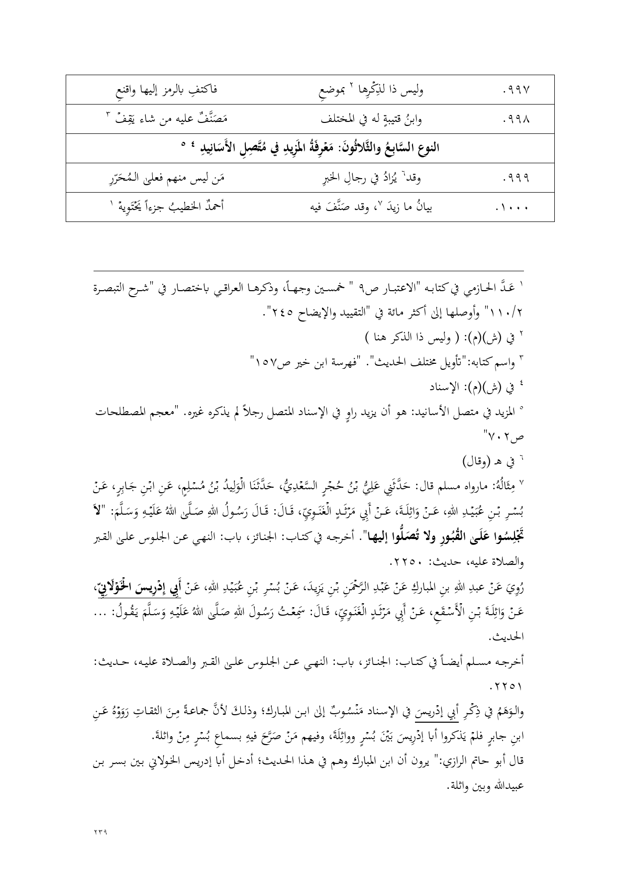 (¬6) مِثَالُهُ: مارواه مسلم قال: حَدَّثَنِي عَلِيُّ بْنُ حُجْرٍ السَّعْدِيُّ، حَدَّثَنَا الْوَلِيدُ بْنُ مُسْلِمٍ، عَنِ ابْنِ جَابِرٍ، عَنْ بُسْرِ بْنِ عُبَيْدِ اللهِ، عَنْ وَاثِلَةَ، عَنْ أَبِي مَرْثَدٍ الْغَنَوِيِّ، قَالَ: قَالَ رَسُولُ اللهِ صَلَّى اللهُ عَلَيْهِ وَسَلَّمَ: "لاَ تَجْلِسُوا عَلَى القُبُورِ ولا تُصَلُّوا إليها". أخرجه في كتاب: الجنائز، باب: النهي عن الجلوس على القبر والصلاة عليه، حديث: 2250.