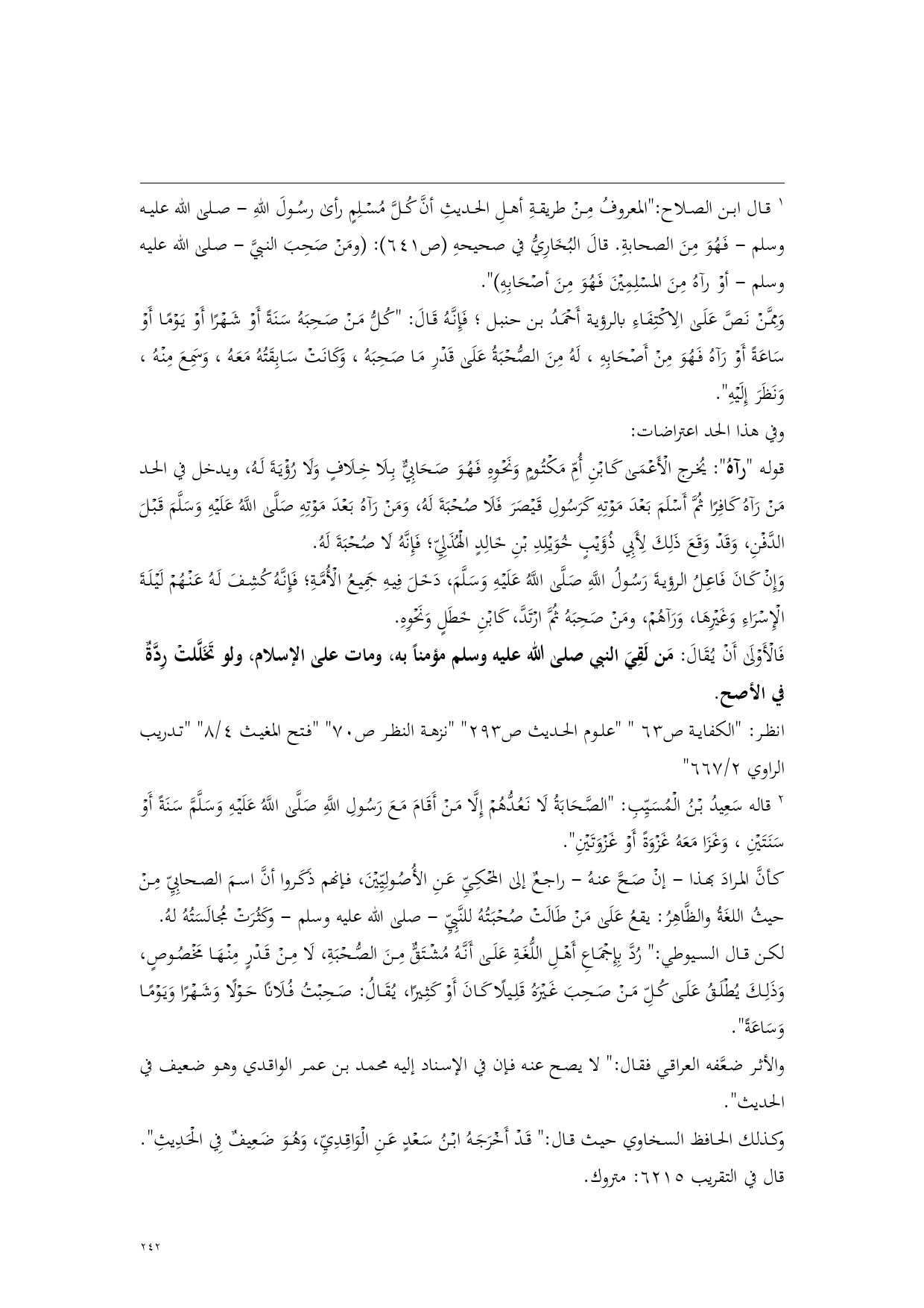 لكن قال السيوطي: " رُدَّ بِإِجْمَاعِ أَهْلِ اللُّغَةِ عَلَى أَنَّهُ مُشْتَقٌّ مِنَ الصُّحْبَةِ، لَا مِنْ قَدْرٍ مِنْهَا مَخْصُوصٍ، وَذَلِكَ يُطْلَقُ عَلَى كُلِّ مَنْ صَحِبَ غَيْرَهُ قَلِيلًا كَانَ أَوْ كَثِيرًا، يُقَالُ: صَحِبْتُ فُلَانًا حَوْلًا وَشَهْرًا وَيَوْمًا وَسَاعَةً".