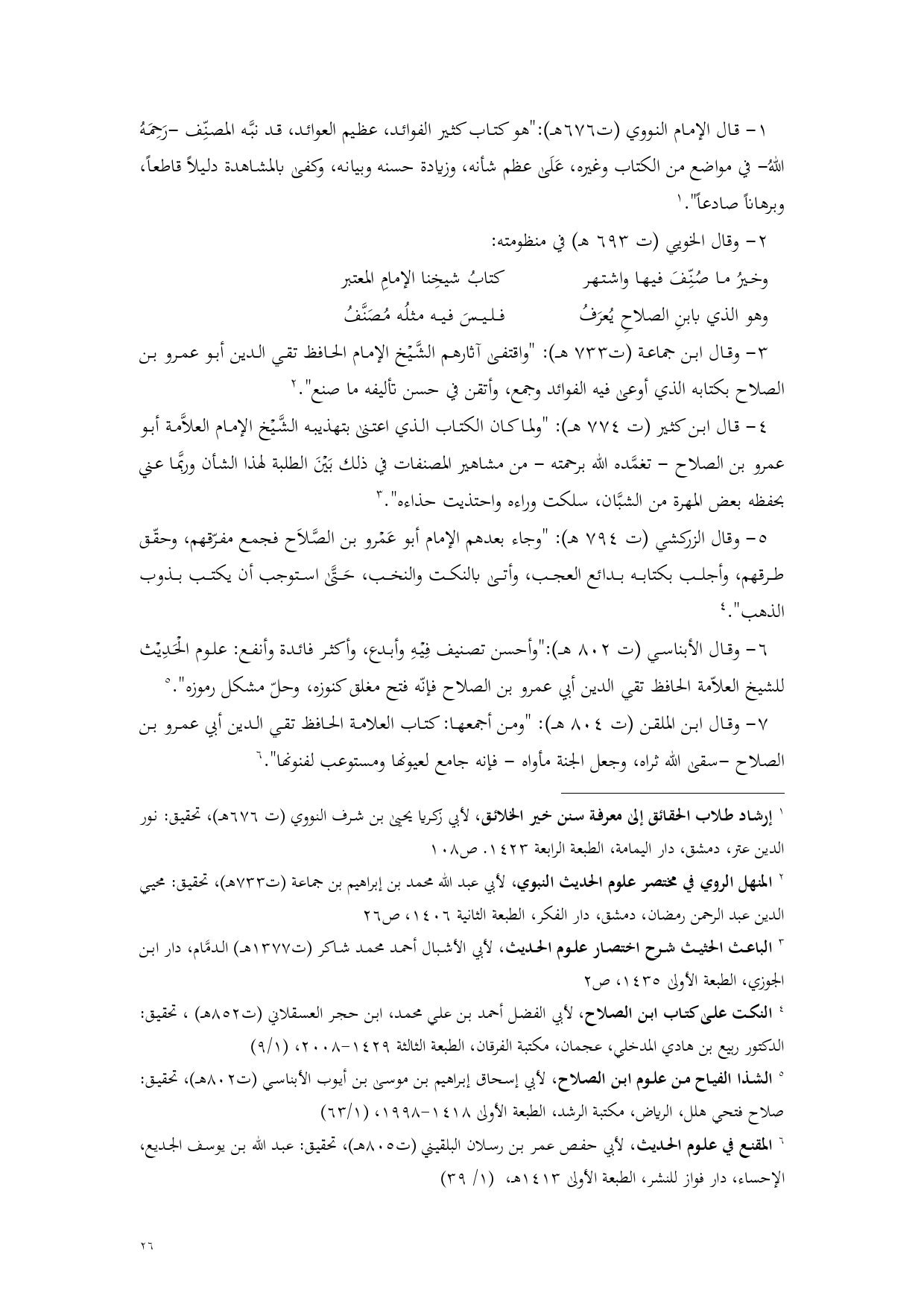 6 - وقال الأبناسي (ت 802 هـ): "وأحسن تصنيف فِيْهِ وأبدع، وأكثر فائدة وأنفع: علوم الْحَدِيْث للشيخ العلاّمة الحافظ تقي الدين أبي عمرو بن الصلاح فإنّه فتح مغلق كنوزه، وحلّ مشكل رموزه". (¬5)