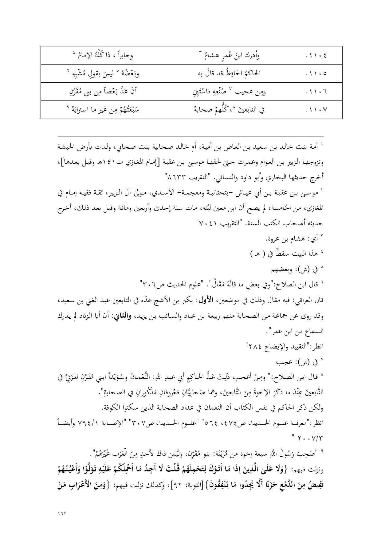 (¬6) قال ابن الصلاح: " ومِنْ أعجبِ ذَلِكَ عَدُّ الحاكِمِ أبي عبدِ اللهِ: النُّعْمانَ وسُوَيْداً ابني مُقَرَّنٍ المزَنِيَّ في التَّابعينَ عِنْدَ ما ذكَرَ الإخوةَ مِنَ التَّابعينَ، وهما صَحابِيَّانِ مَعْروفانِ مَذْكُورانِ في الصحابةِ".