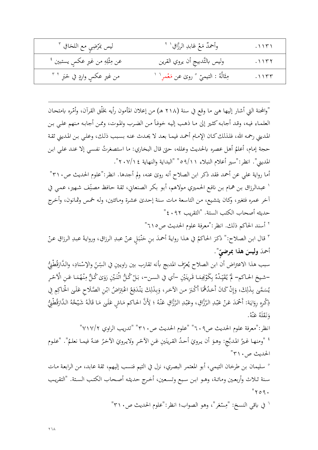 (¬3) قال ابن الصلاح: " ذكرَ الحاكمُ في هذا روايةَ أحمدَ بنِ حَنْبَلٍ عنْ عبدِ الرزاقِ، وروايةَ عبدِ الرزاقِ عنْ أحمدَ وليسَ هذا بمرضيٍّ".