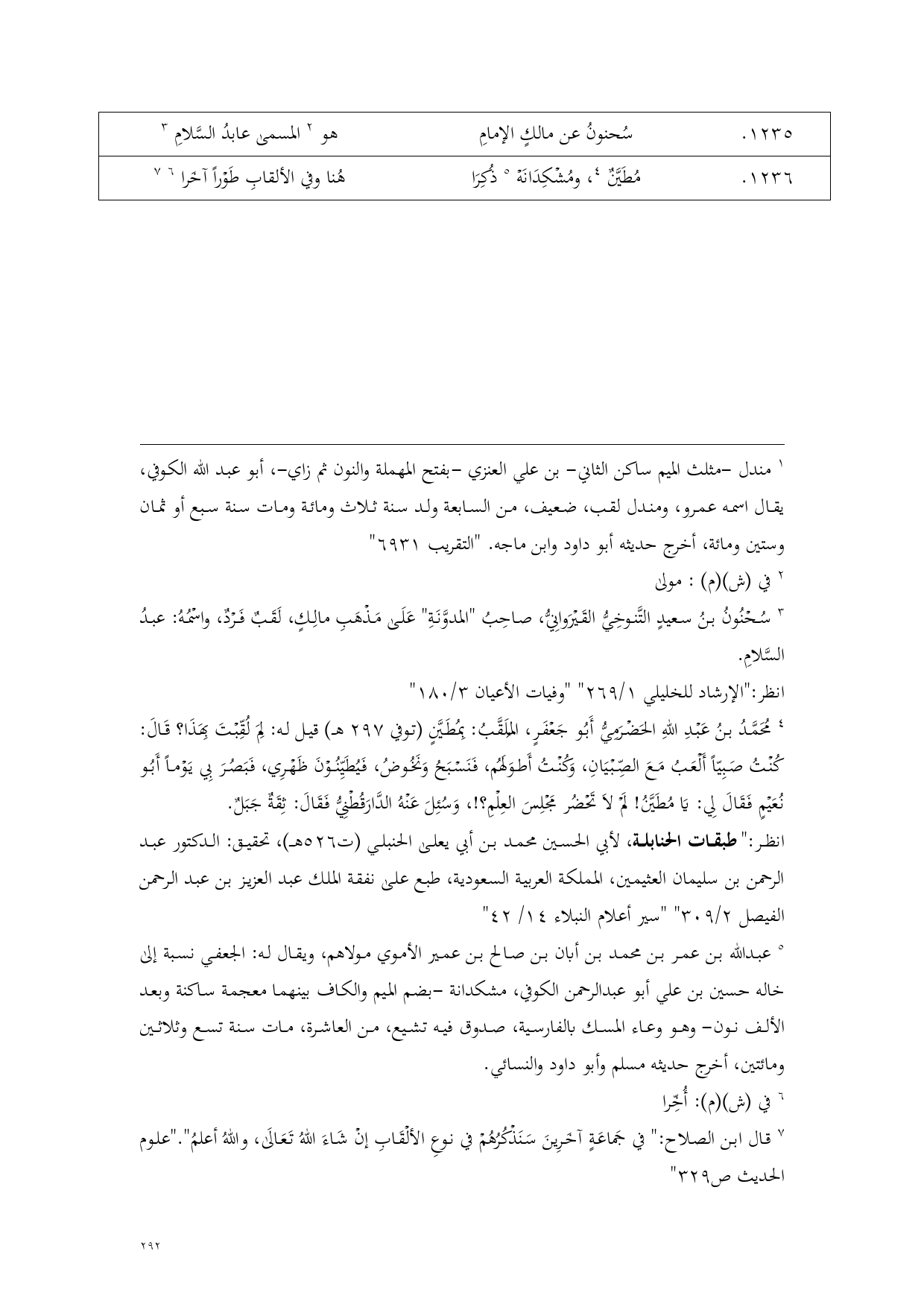 1236 - مُطَيَّنٌ (¬3)، ومُشْكِدَانَهْ (¬4) ذُكِرَا ... هُنا وفي الألقابِ طَوْراً آخَرا (¬5) (¬6)