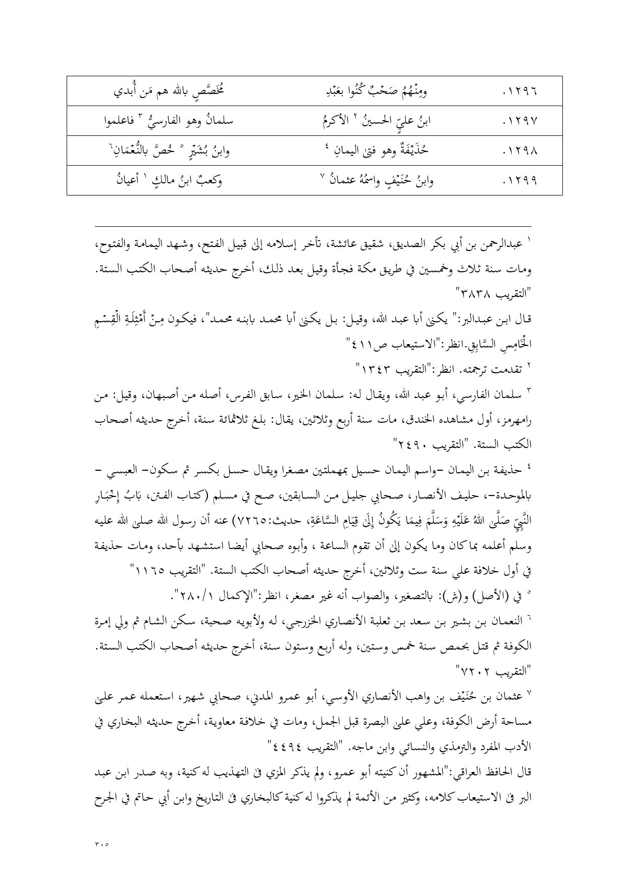 1299 - وابنُ حُنَيْفٍ واسمُهُ عثمانُ (¬6) ... وكعبٌ ابنُ مالكٍ (¬7) أعيانُ