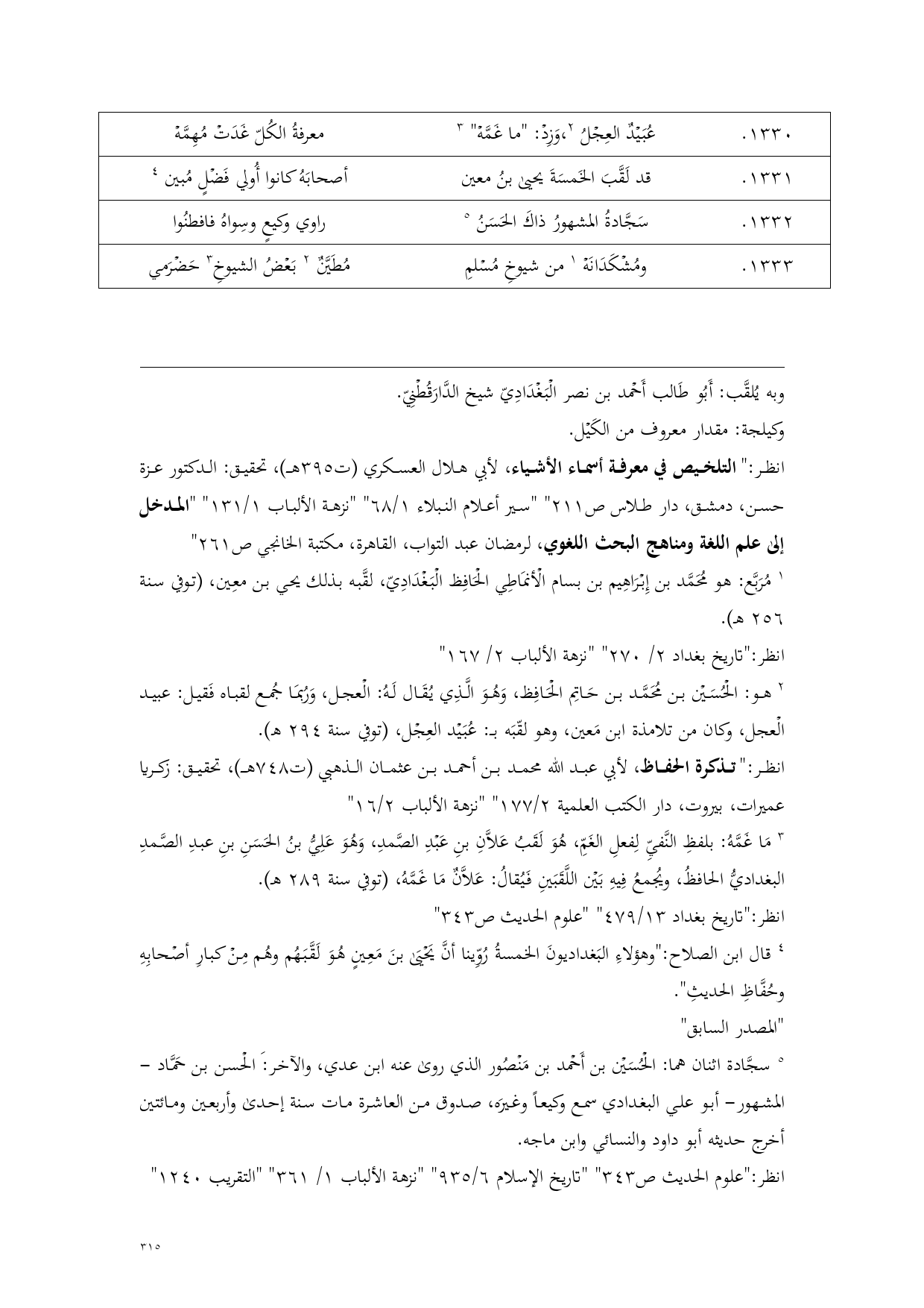 (¬3) قال ابن الصلاح: "وهؤلاءِ البَغداديونَ الخمسةُ رُوِّينا أنَّ يَحْيَى بنَ مَعِينٍ هُوَ لَقَّبَهُم وهُم مِنْ كبارِ أصْحابِهِ وحُفَّاظِ الحديثِ".