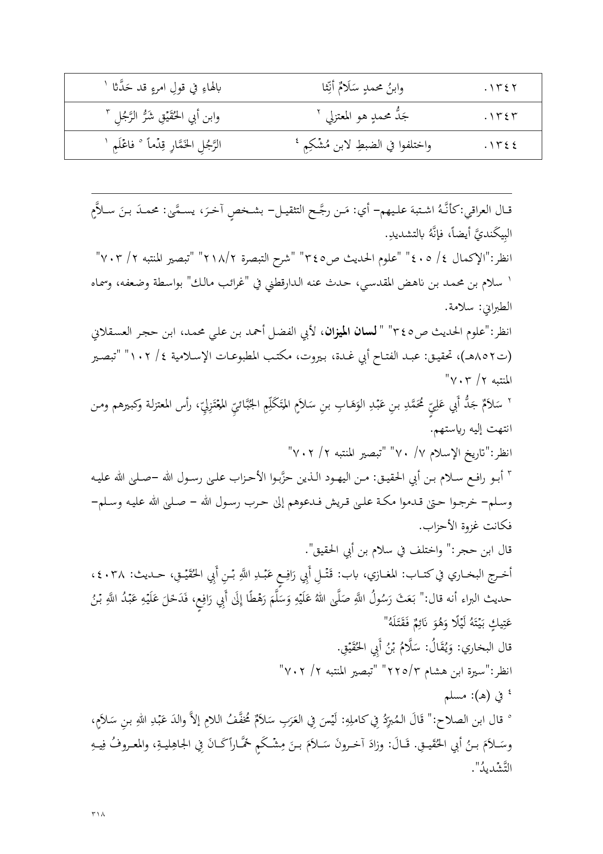 (¬5) قال ابن الصلاح: " قَالَ المُبرِّدُ فِي كاملِهِ: لَيْسَ فِي العَرَبِ سَلاَمٌ مُخفَّفُ اللامِ إلاَّ والدَ عَبْدِ اللهِ بنِ سَلاَمٍ، وسَلاَمَ بنُ أبي الحُقَيقِ. قَالَ: وزادَ آخرونَ سَلاَمَ بنَ مِشْكَمٍ خَمَّاراً كَانَ فِي الجاهِليةِ، والمعروفُ فِيهِ التَّشْديدُ".
