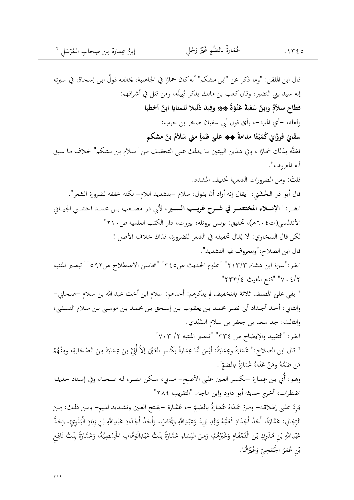 1345 - عُمَارةٌ بالضَّمِ غَيْرُ رَجُلِ ... إبنُ عِمارهْ مِن صِحابِ المُرْسَلِ (¬1)
