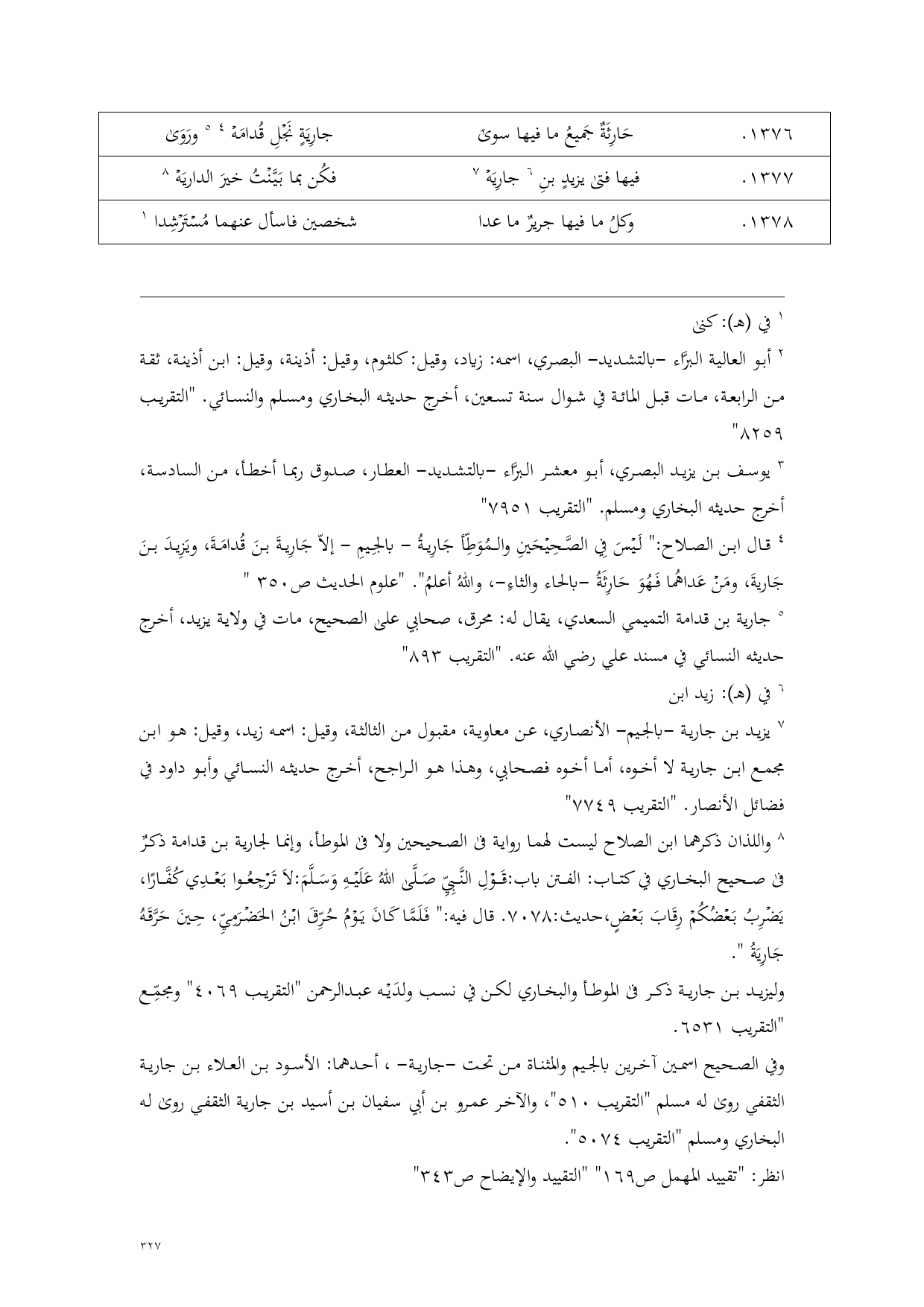 (¬1) قال ابن الصلاح: " لَيْسَ فِي الصَّحِيْحَينِ والمُوَطِّأ جَارِيةُ - بالجِيمِ - إلاّ جَارِيةَ بنَ قُدامَةَ، ويَزِيدَ بنَ جَاريةَ، ومَنْ عَداهُما فَهُوَ حَارِثَةُ -بالحاء والثاءِ-، واللهُ أعلمُ". "علوم الحديث ص 350 "