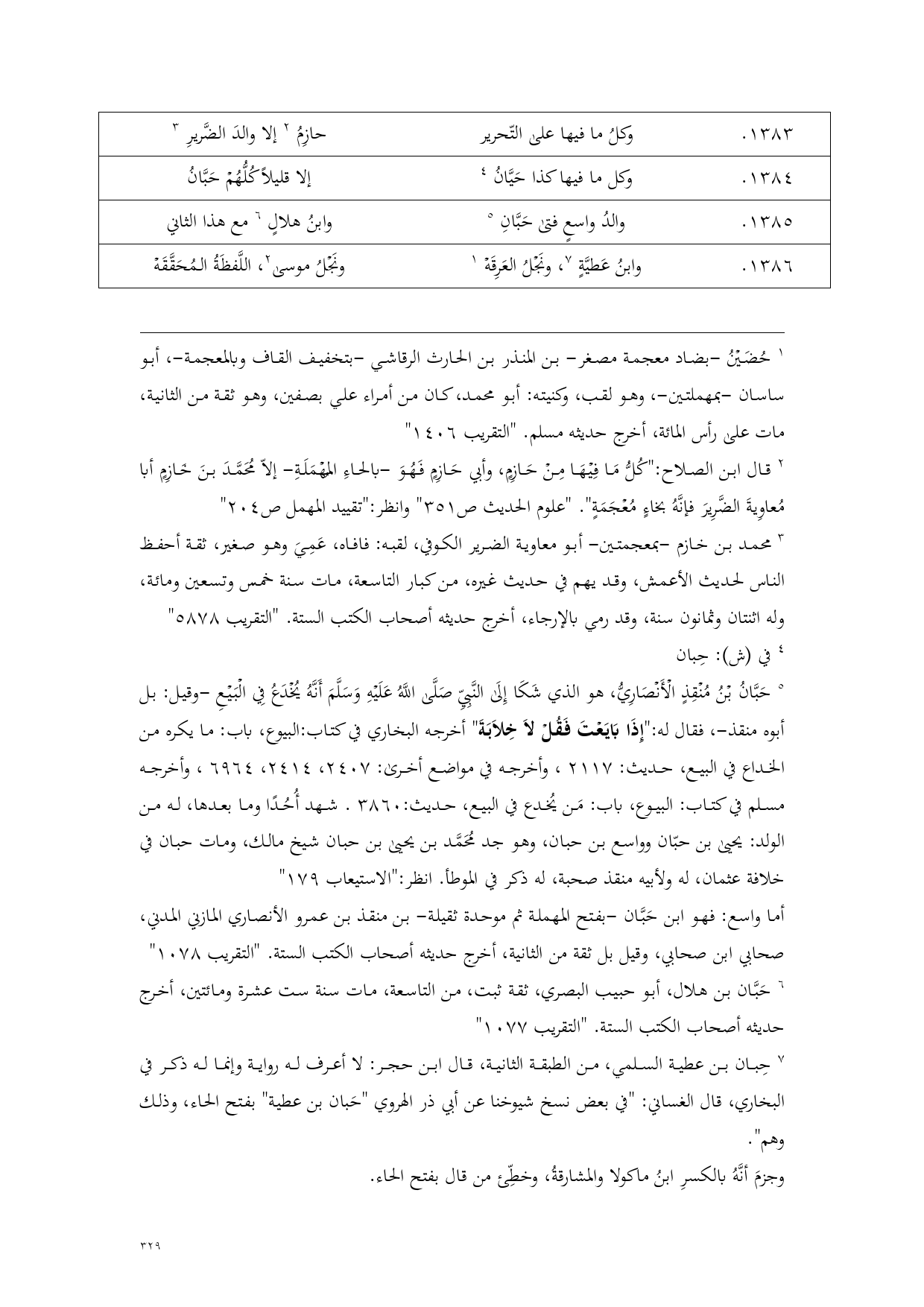 (¬6) حِبان بن عطية السلمي، من الطبقة الثانية، قال ابن حجر: لا أعرف له رواية وإنما له ذكر في البخاري، قال الغساني: "في بعض نسخ شيوخنا عن أبي ذر الهروي "حَبان بن عطية" بفتح الحاء، وذلك وهم".