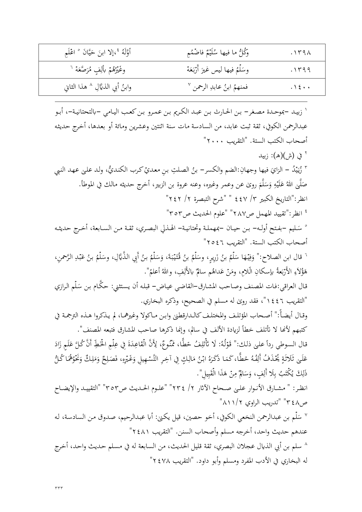 (¬3) قال ابن الصلاح: " وَفِيْهَا سَلْمُ بنُ زَرِيرٍ، وسَلْمُ بنُ قُتَيْبَةَ، وَسَلْمُ بنُ أَبِي الذَّيَّالِ، وسَلْمُ بنُ عَبْدِ الرَّحمنِ، هَؤُلاَءِ الأَرْبَعةُ بإسكانِ الّلامِ، ومَنْ عَداهُم سالمٌ بالأَلِفِ، واللهُ أعلمُ".