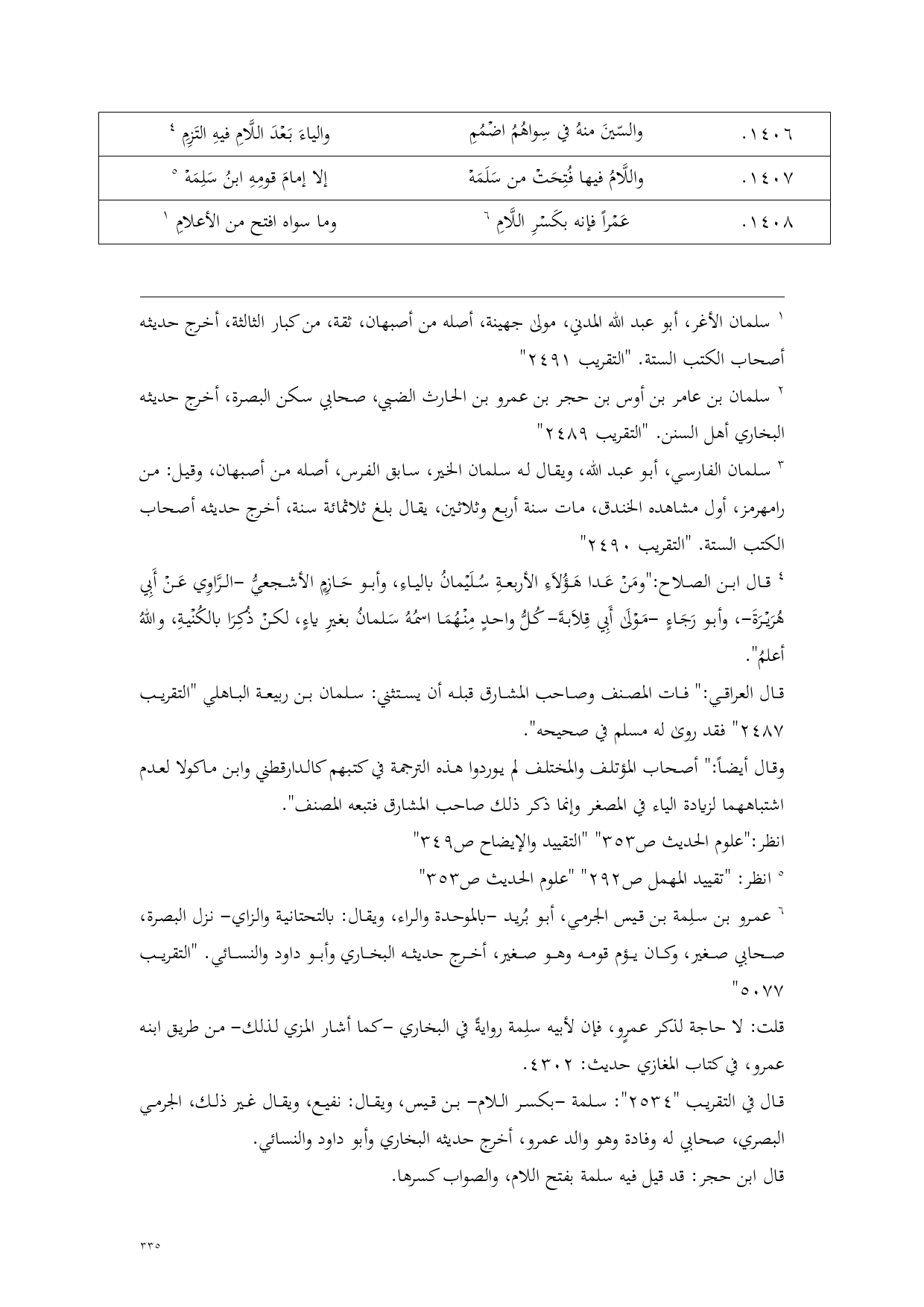 (¬1) قال ابن الصلاح: "ومَنْ عَدا هَؤُلاَءِ الأربعةِ سُلَيْمانُ بالياءِ، وأبو حَازِمٍ الأشجعيُّ -الرَّاوِي عَنْ أَبِي هُرَيْرَةَ-، وأبو رَجَاءٍ -مَوْلَى أَبِي قِلاَبةَ- كُلُّ واحدٍ مِنْهُمَا اسمُهُ سَلمانُ بغيرِ ياءٍ، لكنْ ذُكِرَا بالكُنْيةِ، واللهُ أعلمُ".