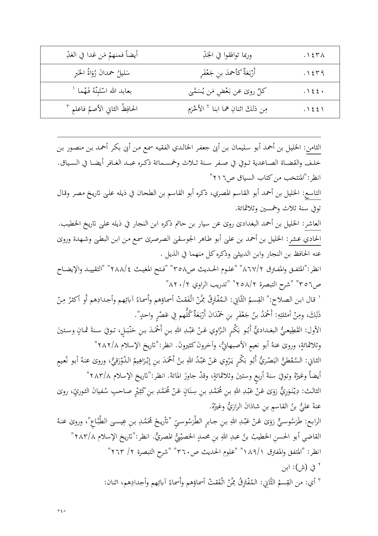 (¬1) قال ابن الصلاح: " القِسمُ الثَّانِي: المُفْتَرِقُ مِمَّنْ اتَّفَقتْ أسماؤهم وأَسماءُ آبائِهم وأجدادِهم أَو أكثرُ مِنْ ذَلِكَ، ومِنْ أمثلتِهِ: أَحْمَدُ بنُ جَعْفَرِ بنِ حَمْدَانَ أَرْبَعَةٌ كُلُّهم فِي عَصْرٍ واحدٍ".