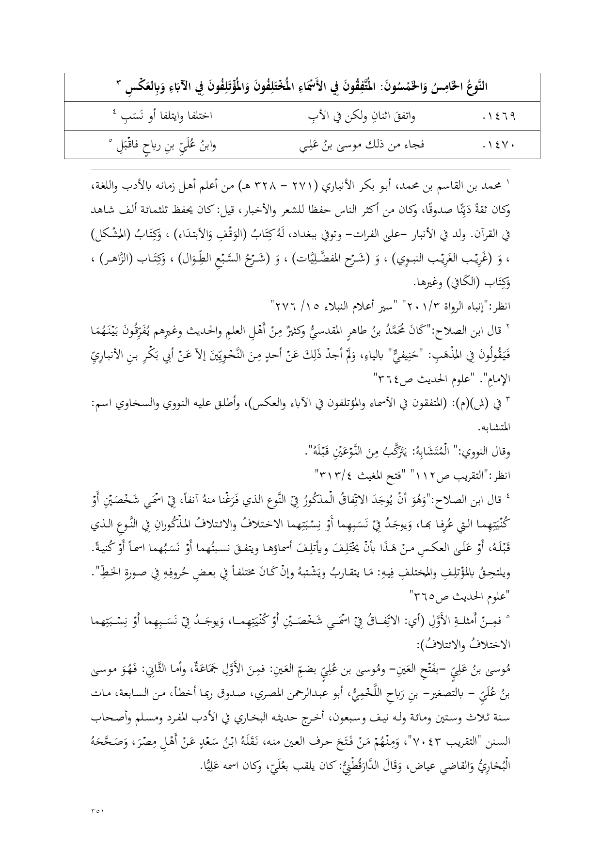النَّوعُ الخَامِسُ وَالخَمْسُونَ: المُتَّفِقُونَ فِي الأَسْمَاءِ المُخْتَلِفُونَ وَالمُؤْتَلِفُونَ فِي الآبَاءِ وَبِالعَكْسِ (¬1)