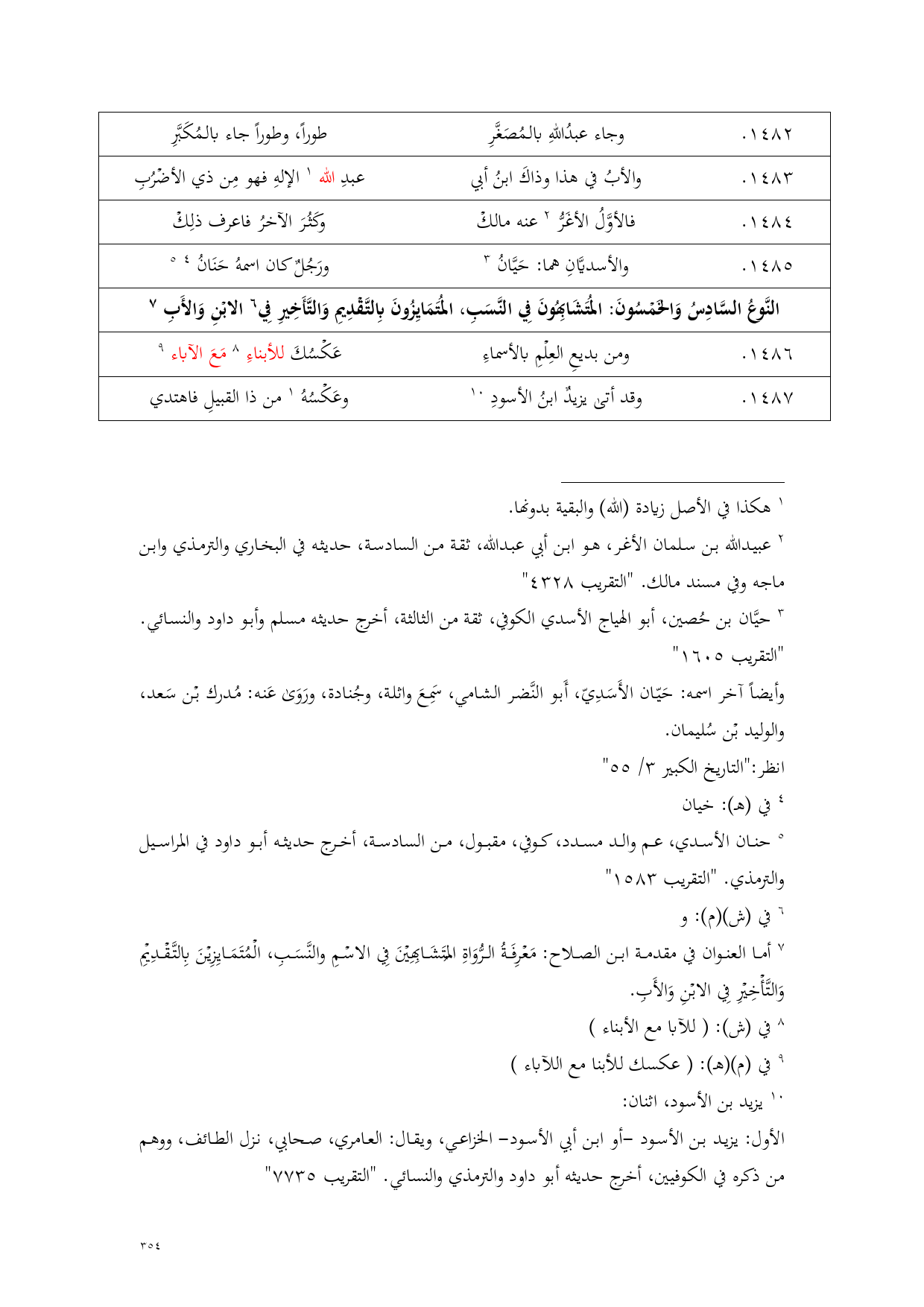 (¬7) أما العنوان في مقدمة ابن الصلاح: مَعْرِفَةُ الرُّوَاةِ المُتَشَابِهِيْنَ فِي الاسْمِ والنَّسَبِ، الْمُتَمَايِزِيْنَ بِالتَّقْدِيْمِ وَالتَّأْخِيْرِ فِي الابْنِ وَالأَبِ.