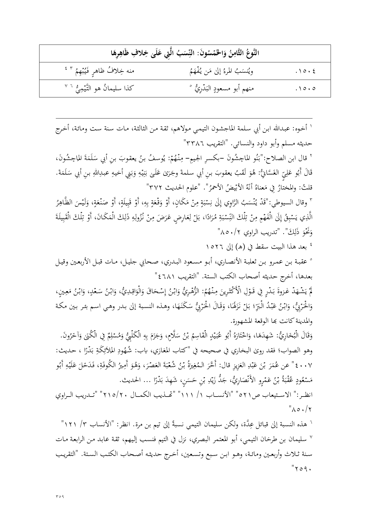 (¬1) وقال السيوطي: "قَدْ يُنْسَبُ الرَّاوِي إِلَى نِسْبَةٍ مِنْ مَكَانٍ، أَوْ وَقْعَةٍ بِهِ، أَوْ قَبِيلَةٍ، أَوْ صَنْعَةٍ، وَلَيْسَ الظَّاهِرُ الَّذِي يَسْبِقُ إِلَى الْفَهْمِ مِنْ تِلْكَ النِّسْبَةِ مُرَادًا، بَلْ لِعَارِضٍ عَرَضَ مِنْ نُزُولِهِ ذَلِكَ الْمَكَانَ، أَوْ تِلْكَ الْقَبِيلَةَ وَنَحْوَ ذَلِكَ". "تدريب الراوي 2/ 850"