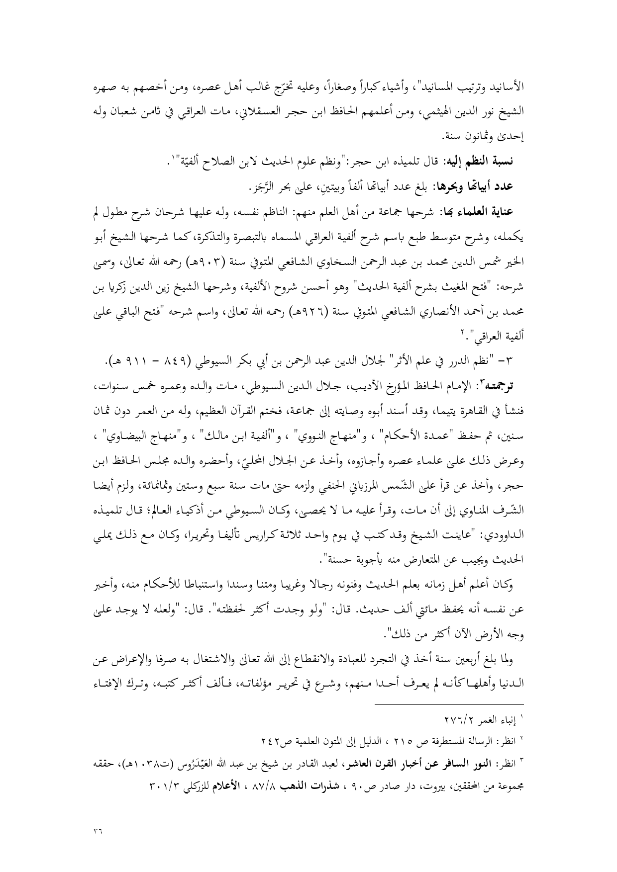 3 - "نظم الدرر في علم الأثر" لجلال الدين عبد الرحمن بن أبي بكر السيوطي (849 - 911 هـ).