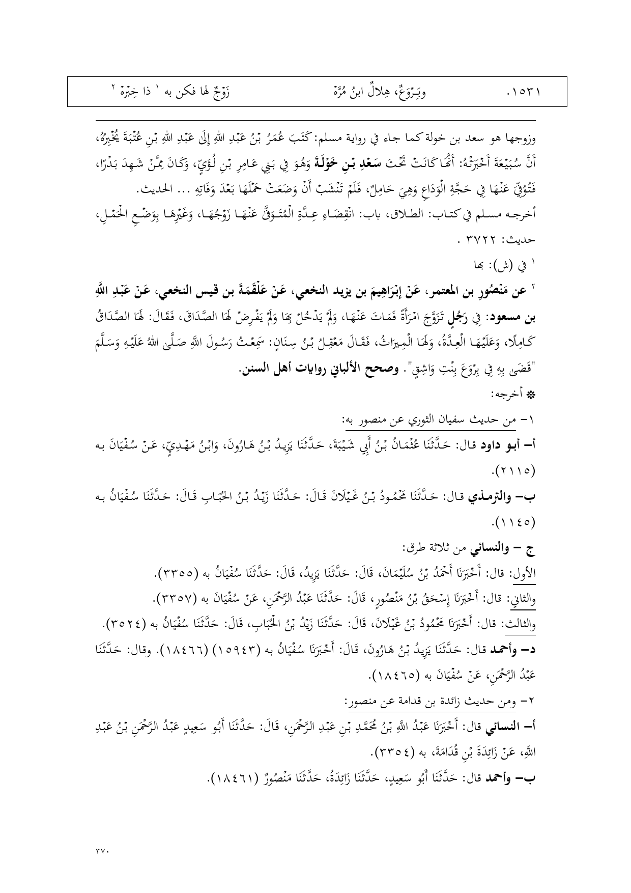 (¬2) عن مَنْصُورِ بن المعتمر، عَنْ إِبْرَاهِيمَ بن يزيد النخعي، عَنْ عَلْقَمَةَ بن قيس النخعي، عَنْ عَبْدِ اللَّهِ بن مسعود: فِي رَجُلٍ تَزَوَّجَ امْرَأَةً فَمَاتَ عَنْهَا، وَلَمْ يَدْخُلْ بِهَا وَلَمْ يَفْرِضْ لَهَا الصَّدَاقَ، فَقَالَ: لَهَا الصَّدَاقُ كَامِلًا، وَعَلَيْهَا الْعِدَّةُ، وَلَهَا الْمِيرَاثُ، فَقَالَ مَعْقِلُ بْنُ سِنَانٍ: سَمِعْتُ رَسُولَ اللَّهِ صَلَّى اللهُ عَلَيْهِ وَسَلَّمَ "قَضَى بِهِ فِي بِرْوَعَ بِنْتِ وَاشِقٍ". وصحح الألباني روايات أهل السنن.