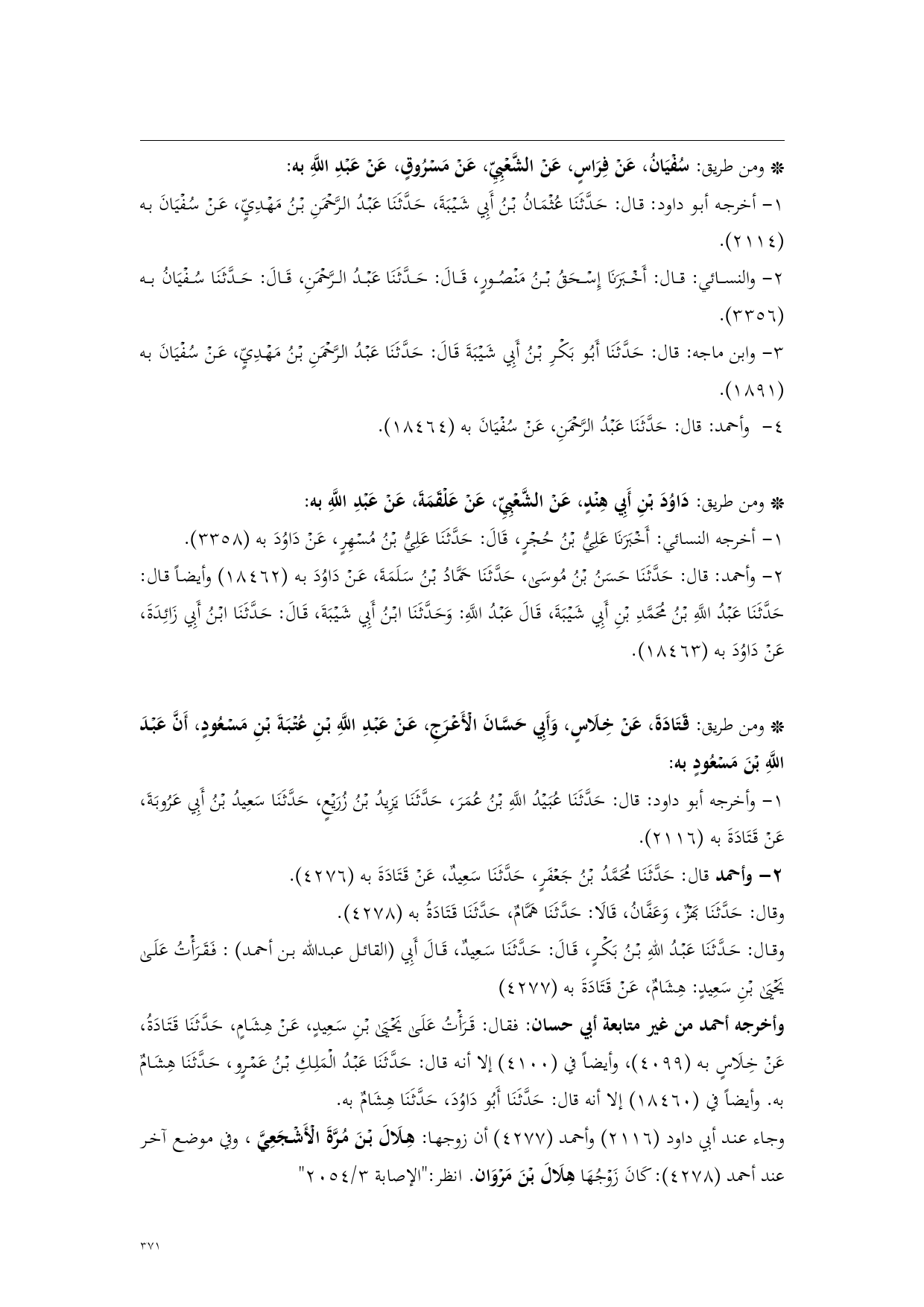 * ومن طريق: قَتَادَةَ، عَنْ خِلَاسٍ، وَأَبِي حَسَّانَ الْأَعْرَجِ، عَنْ عَبْدِ اللَّهِ بْنِ عُتْبَةَ بْنِ مَسْعُودٍ، أَنَّ عَبْدَ اللَّهِ بْنَ مَسْعُودٍ به: