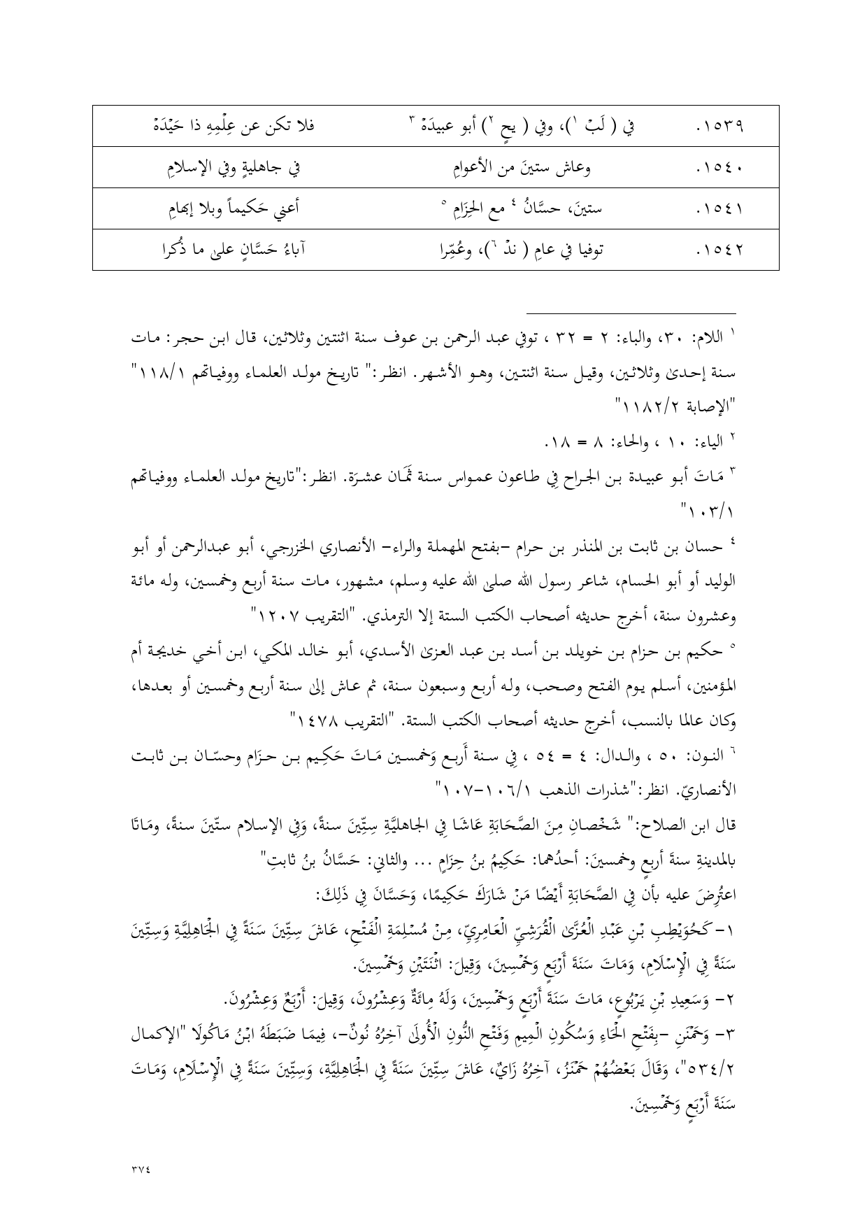 قال ابن الصلاح: " شَخْصانِ مِنَ الصَّحَابَةِ عَاشَا فِي الجاهليَّةِ سِتِّينَ سنةً، وَفِي الإسلام ستّينَ سنةً، ومَاتَا بالمدينةِ سنةَ أربعٍ وخمسينَ: أحدُهما: حَكِيمُ بنُ حِزَامٍ ... والثاني: حَسَّانُ بنُ ثابتِ"