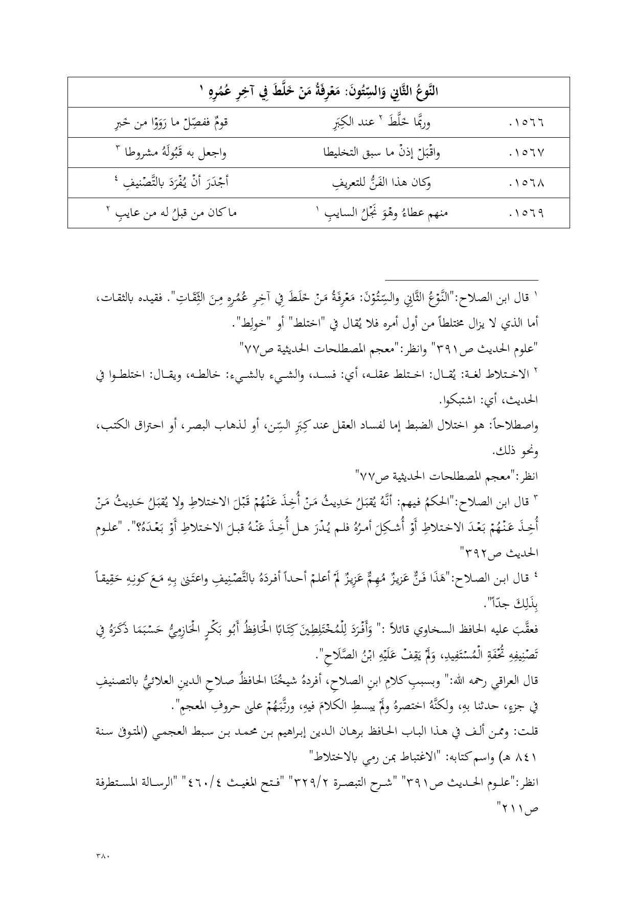 (¬1) قال ابن الصلاح: "النَّوْعُ الثَّانِي والسِّتُوْنَ: مَعْرِفَةُ مَنْ خَلَطَ فِي آخِرِ عُمُرِهِ مِنَ الثِّقَاتِ". فقيده بالثقات، أما الذي لا يزال مختلطاً من أول أمره فلا يُقال في "اختلط" أو "خولِط".