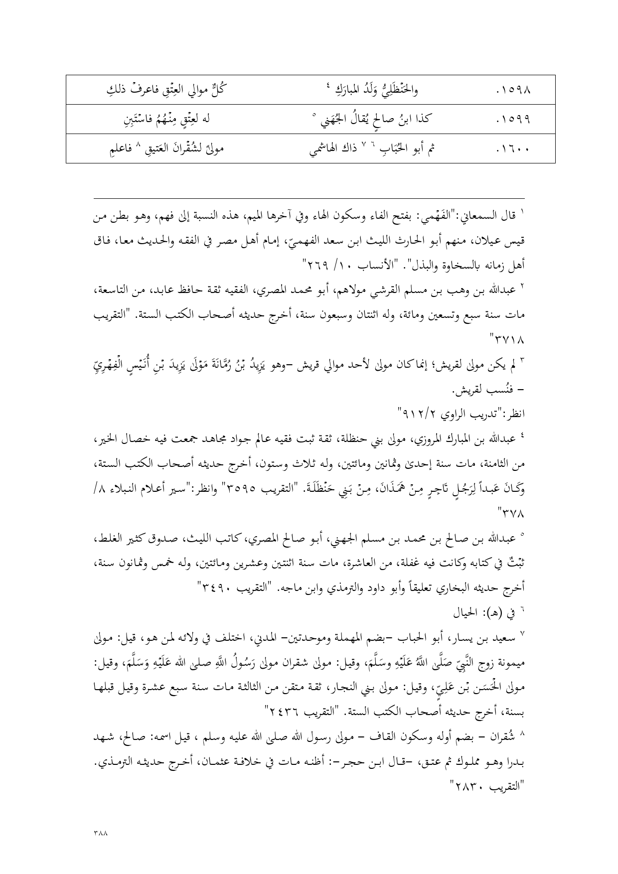 1598 - والحَنْظَلِيُّ وَلَدُ المبارَكِ (¬1) ... كُلٌّ موالي العِتْقِ فاعرفْ ذلك