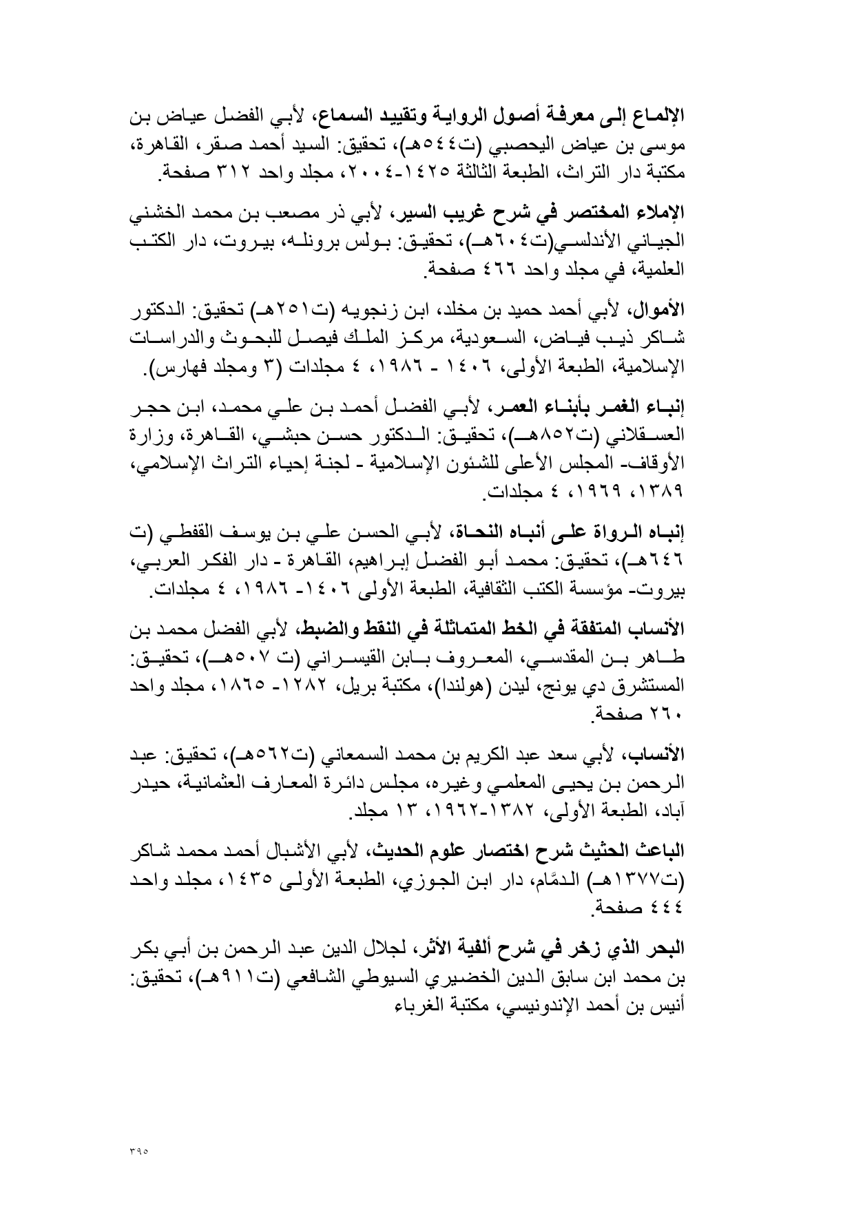 الإلماع إلى معرفة أصول الرواية وتقييد السماع، لأبي الفضل عياض بن موسى بن عياض اليحصبي (ت 544 هـ)، تحقيق: السيد أحمد صقر، القاهرة، مكتبة دار التراث، الطبعة الثالثة 1425 - 2004، مجلد واحد 312 صفحة.