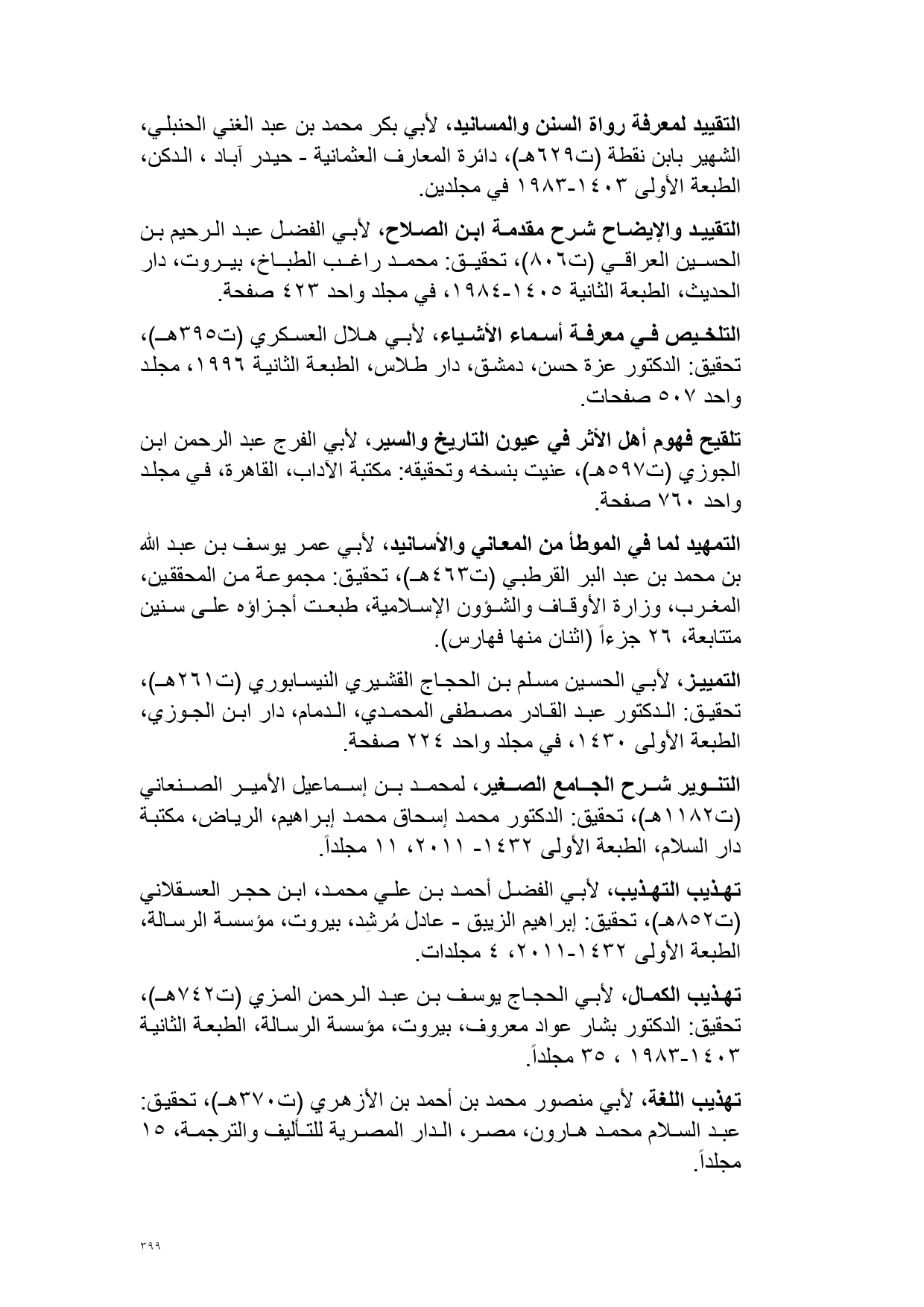 تهذيب الكمال، لأبي الحجاج يوسف بن عبد الرحمن المزي (ت 742 هـ)، تحقيق: الدكتور بشار عواد معروف، بيروت، مؤسسة الرسالة، الطبعة الثانية 1403 - 1983، 35 مجلداً.