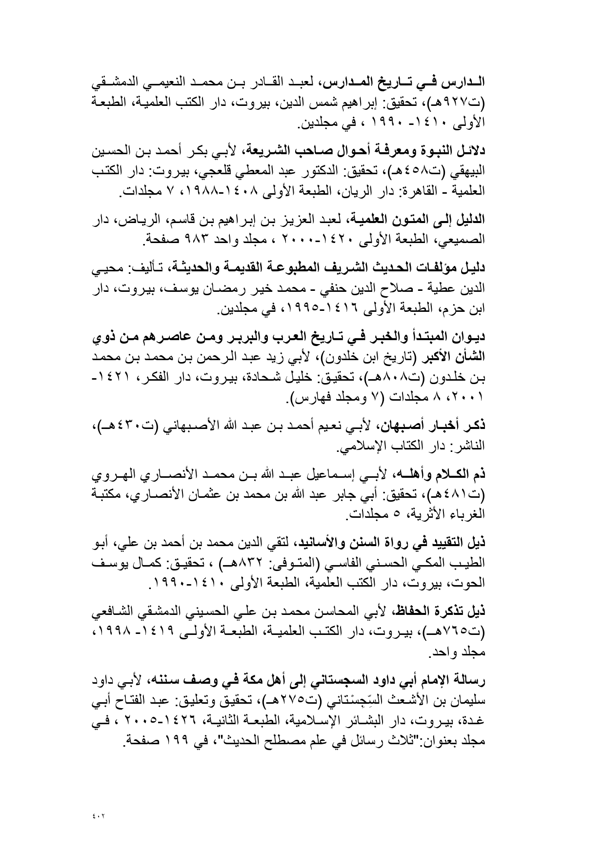الدارس في تاريخ المدارس، لعبد القادر بن محمد النعيمي الدمشقي (ت 927 هـ)، تحقيق: إبراهيم شمس الدين، بيروت، دار الكتب العلمية، الطبعة الأولى 1410 - 1990، في مجلدين.